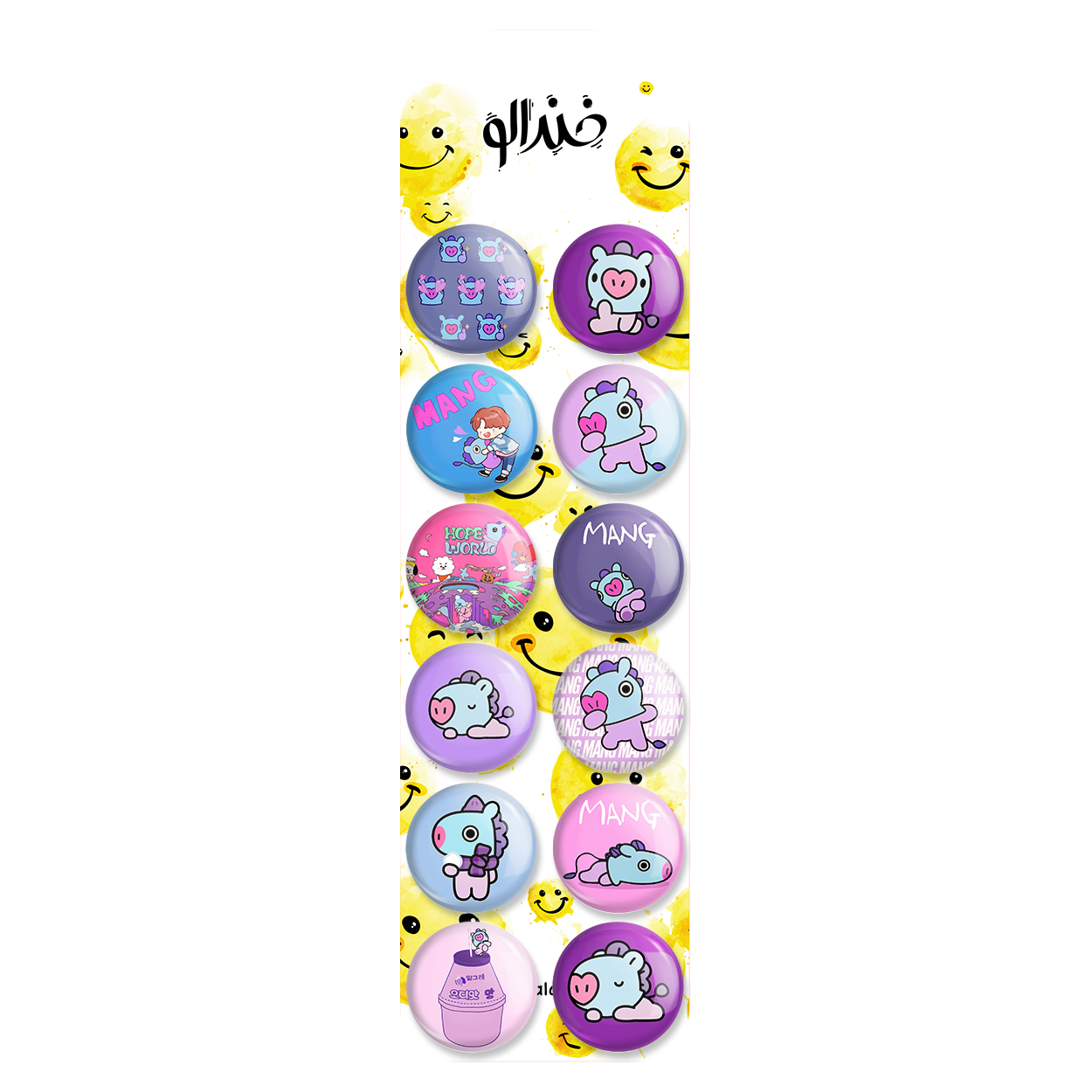 پک 12 عددی پیکسل خندالو طرح مانگ BT21 Mang با روکش سلفون حرارتی براق ضدخش و قطعه پشتی رنگی تولید شده است. قطعات پشتی از میان 6 رنگ سفید، مشکی، صورتی، زرد، آبی و قرمز که با توجه به نوع و رنگبندی طرح روی پیکسل انتخاب شده اند تولید می شود و در هر بسته بندی مطابق عکس محصول می باشد. قطعات پلاستیکی پشت پیکسل با سوزن یک تکه ثابت و بدون لغزش و جا به جایی، ایستایی بسیار بهتری نسبت به پشتی فلزی پیکسل دارند که این مهم در تولید این محصول نیز رعایت شده است.
