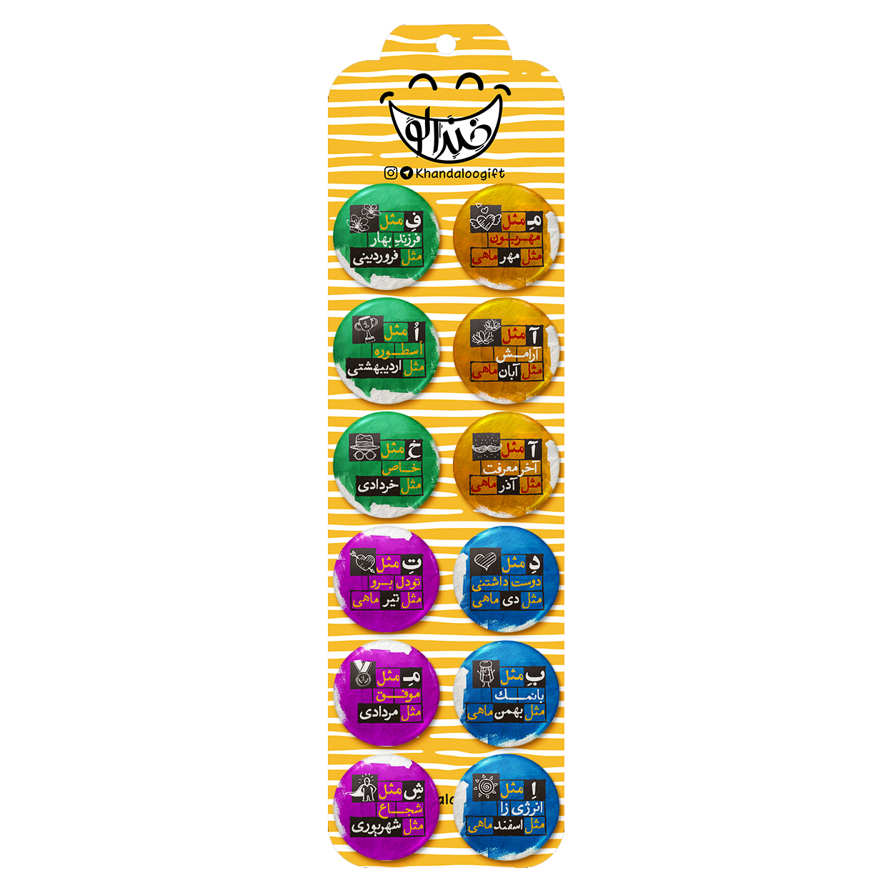 پک 12 عددی پیکسل خندالو طرح ماه های تولد با روکش سلفون حرارتی براق ضدخش و قطعه پشتی رنگی تولید شده است. قطعات پشتی از میان 6 رنگ سفید، مشکی، صورتی، زرد، آبی و قرمز که با توجه به نوع و رنگبندی طرح روی پیکسل انتخاب شده اند تولید می شود و در هر بسته بندی مطابق عکس محصول می باشد. قطعات پلاستیکی پشت پیکسل با سوزن یک تکه ثابت و بدون لغزش و جا به جایی، ایستایی بسیار بهتری نسبت به پشتی فلزی پیکسل دارند که این مهم در تولید این محصول نیز رعایت شده است. چاپ پیکسل طرح ماه های تولد بسته ۱۲ عددی نیز با دستگاه های استاندارد و با بهترین سطح کیفی صورت گرفته و طرح با شفافیتی مثال زدنی و با سلفونی بدون شکست نور بر روی پیکسل نقش بسته است.