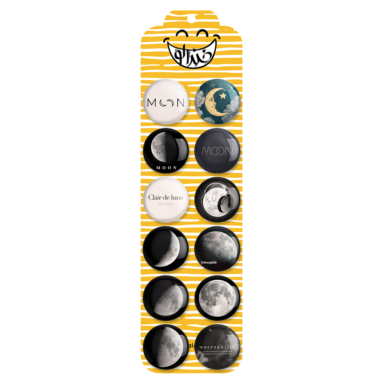 پک 12 عددی پیکسل خندالو طرح ماه (Moon) با روکش سلفون حرارتی براق ضدخش و قطعه پشتی رنگی تولید شده است. قطعات پشتی از میان 6 رنگ سفید، مشکی، صورتی، زرد، آبی و قرمز که با توجه به نوع و رنگبندی طرح روی پیکسل انتخاب شده اند تولید می شود و در هر بسته بندی مطابق عکس محصول می باشد. قطعات پلاستیکی پشت پیکسل با سوزن یک تکه ثابت و بدون لغزش و جا به جایی، ایستایی بسیار بهتری نسبت به پشتی فلزی پیکسل دارند که این مهم در تولید این محصول نیز رعایت شده است. چاپ پیکسل طرح ماه (Moon) بسته ۱۲ عددی نیز با دستگاه های استاندارد و با بهترین سطح کیفی صورت گرفته و طرح با شفافیتی مثال زدنی و با سلفونی بدون شکست نور بر روی پیکسل نقش بسته است.