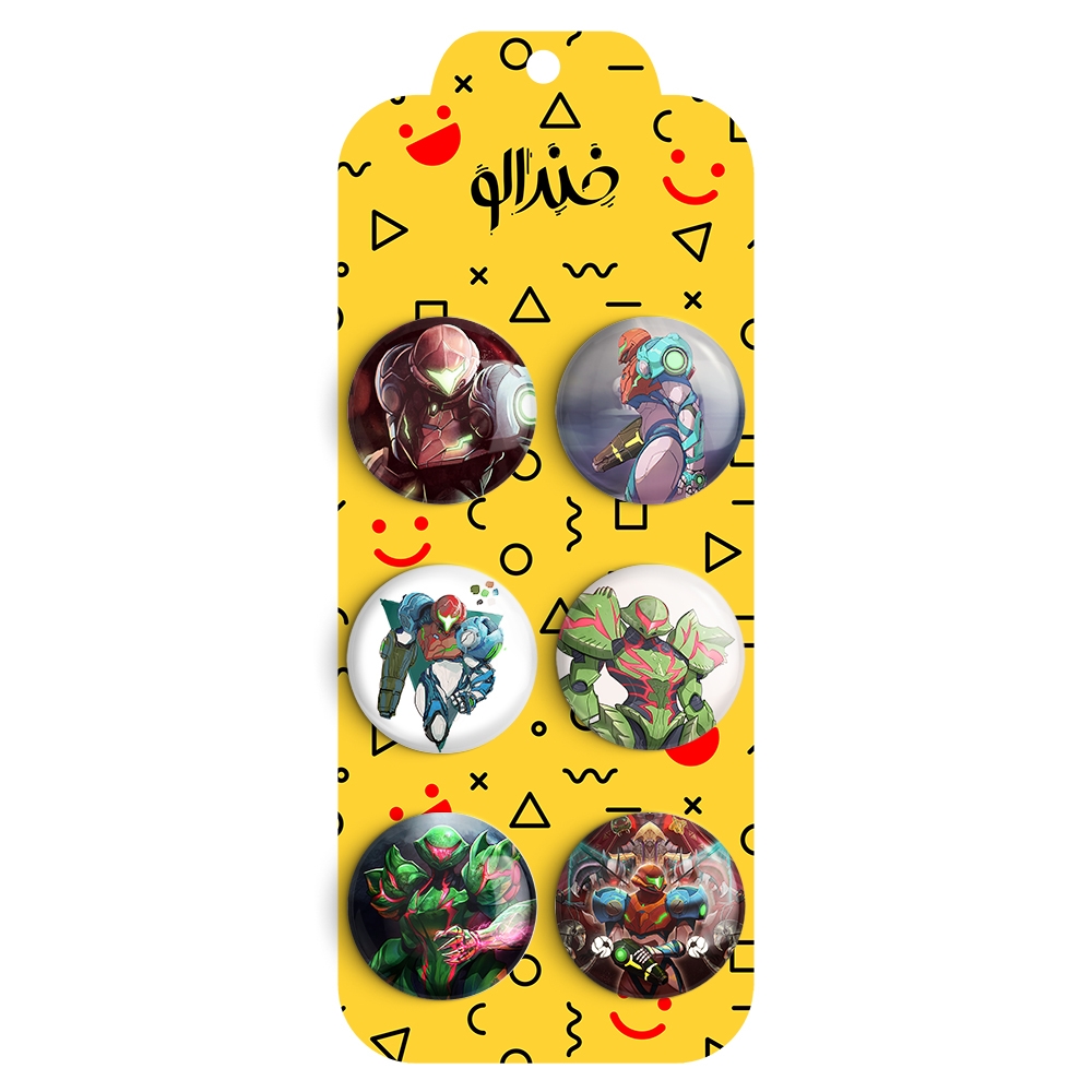 مجموعه 6 عددی پیکسل خندالو طرح متروید (Metroid) با روکش سلفون حرارتی براق ضدخش و قطعه پشتی رنگی تولید شده است. قطعات پشتی از میان 6 رنگ سفید، مشکی، صورتی، زرد، آبی و قرمز که با توجه به نوع و رنگبندی طرح روی پیکسل انتخاب شده اند تولید می شود و در هر بسته بندی مطابق عکس محصول می باشد.