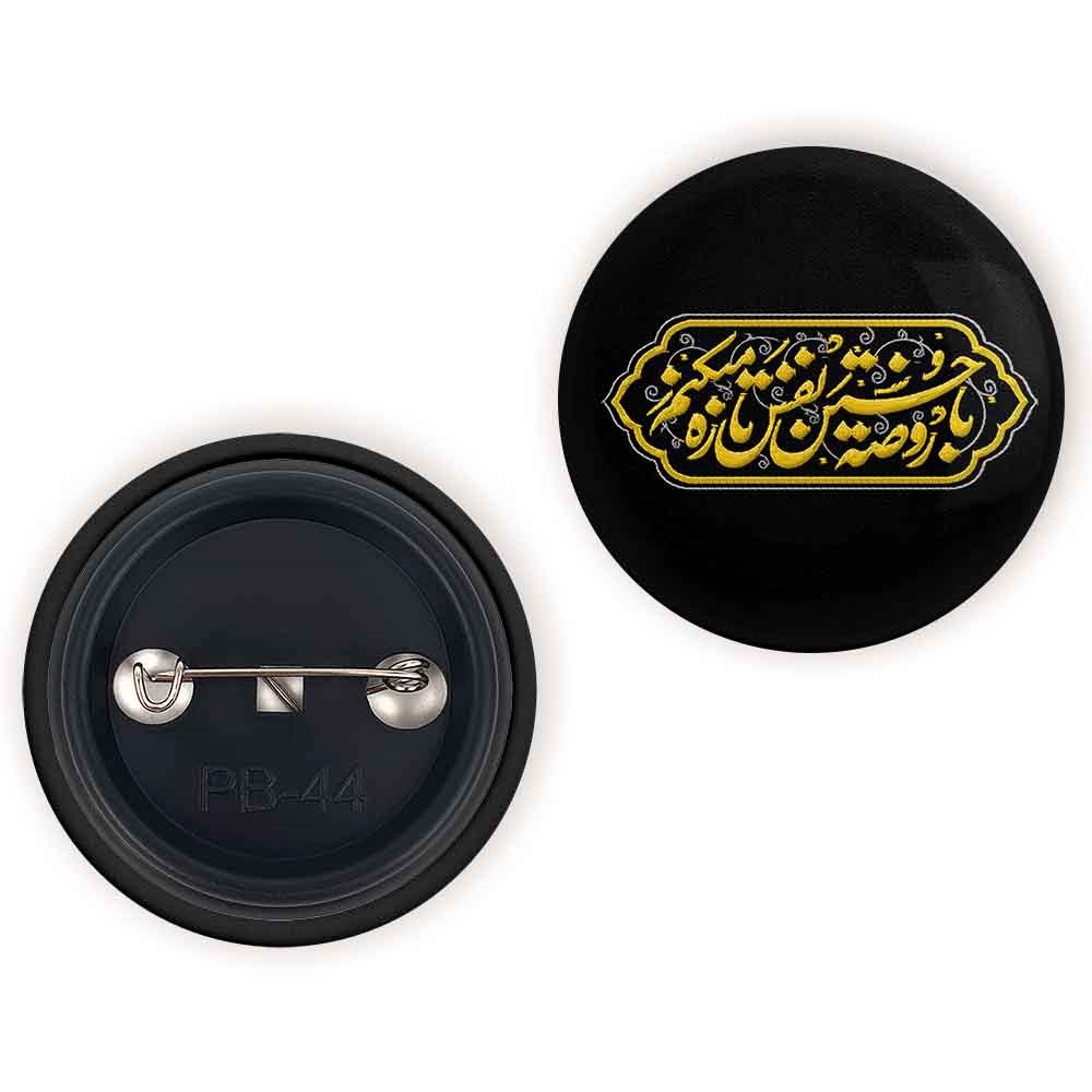 پیکسل 44 میلی متری محرم با روضه حسین نفس تازه میکنم خندالو با روکش سلفون حرارتی مات مخملی ضدخش و قطعه پشتی رنگی تولید شده است.پلاستیکی پشت پیکسل با سوزن یک تکه ثابت و بدون لغزش و جا به جایی، ایستایی بسیار بهتری نسبت به پشتی فلزی پیکسل دارند که این مهم در تولید این محصول نیز رعایت شده است.