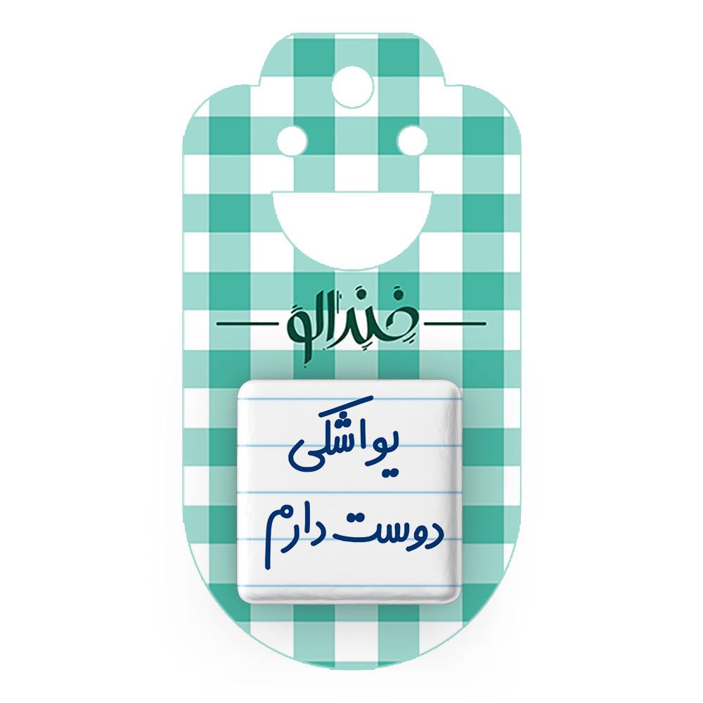 پیکسل 37 میلی متری یواشکی دوست دارم خندالو با روکش براق با وضوح بالا و قطعه پشتی فلزی تولید شده است. قطعه پشت پیکسل مربعی با سوزن یک تکه ثابت و بدون لغزش و جا به جایی، ایستایی بسیار خوبی برای روی لباس یا کیف و یا هر محصول پارچه ای دارد که این مهم در تولید این محصول نیز رعایت شده است. چاپ پیکسل مربعی یواشکی دوست دارم نیز با دستگاه های استاندارد و با بهترین سطح کیفی صورت گرفته و طرح با شفافیتی مثال زدنی و با سلفونی بدون لک و خط و خش بر روی پیکسل نقش بسته است. همچنین بسته بندی جذاب و مینیمال پیکسل یواشکی دوست دارم ، آنها را مناسب هدیه کرده است.