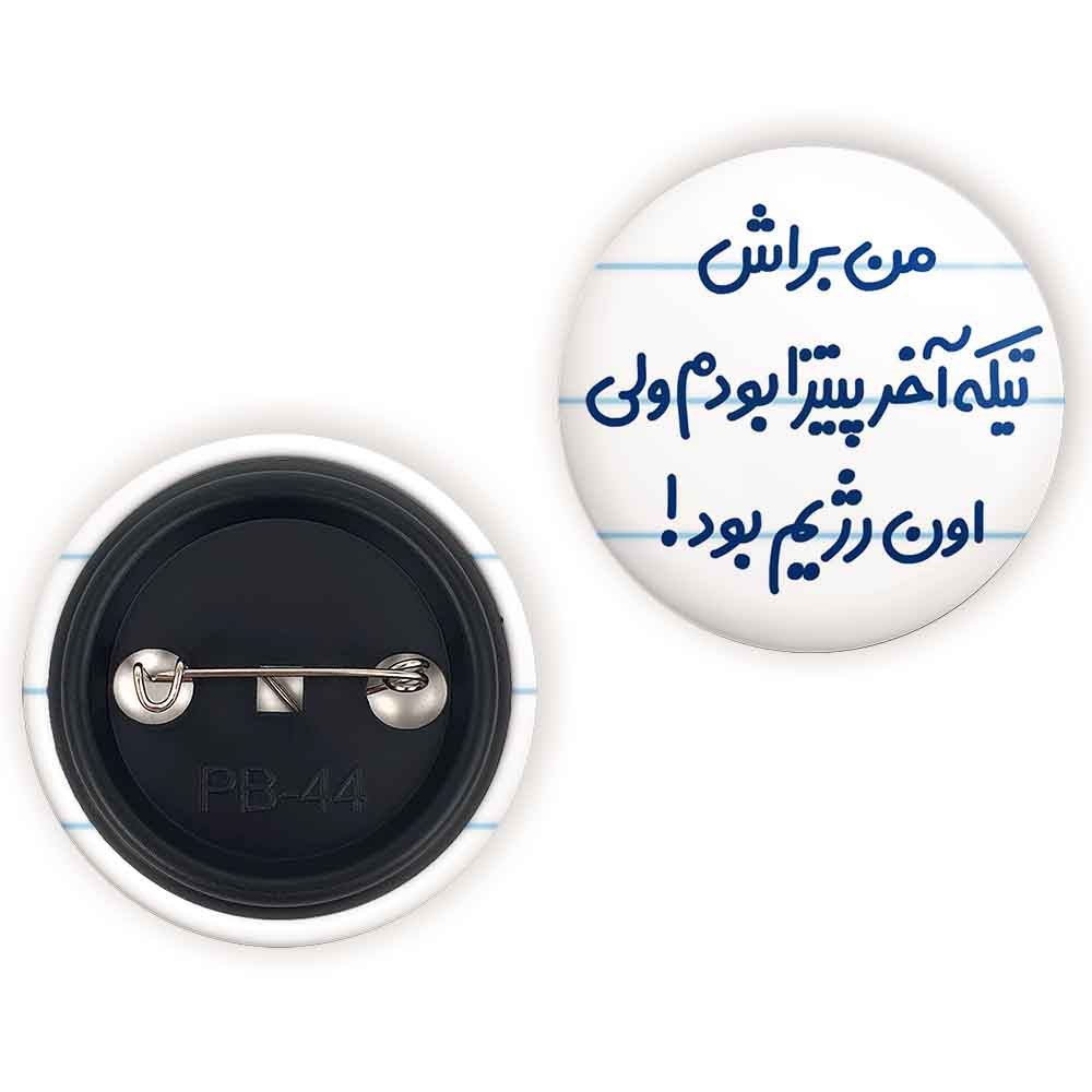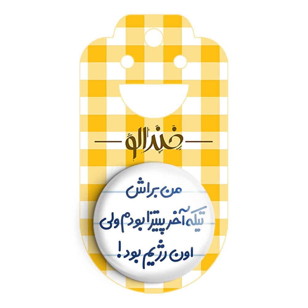 پیکسل 44 میلی متری من براش تیکه آخر پیتزا بودم ولی اون رژیم بود خندالو با روکش سلفون حرارتی مات مخملی ضدخش و قطعه پشتی رنگی تولید شده است. قطعات پلاستیکی پشت پیکسل با سوزن یک تکه ثابت و بدون لغزش و جا به جایی، ایستایی بسیار بهتری نسبت به پشتی فلزی پیکسل دارند که این مهم در تولید این محصول نیز رعایت شده است. چاپ پیکسل من براش تیکه آخر پیتزا بودم ولی اون رژیم بود نیز با دستگاه های استاندارد و با بهترین سطح کیفی صورت گرفته و طرح با شفافیتی مثال زدنی و با سلفونی بدون شکست نور بر روی پیکسل نقش بسته است. همچنین بسته بندی جذاب و مینیمال پیکسل من براش تیکه آخر پیتزا بودم ولی اون رژیم بود ، آنها را مناسب هدیه کرده است.
