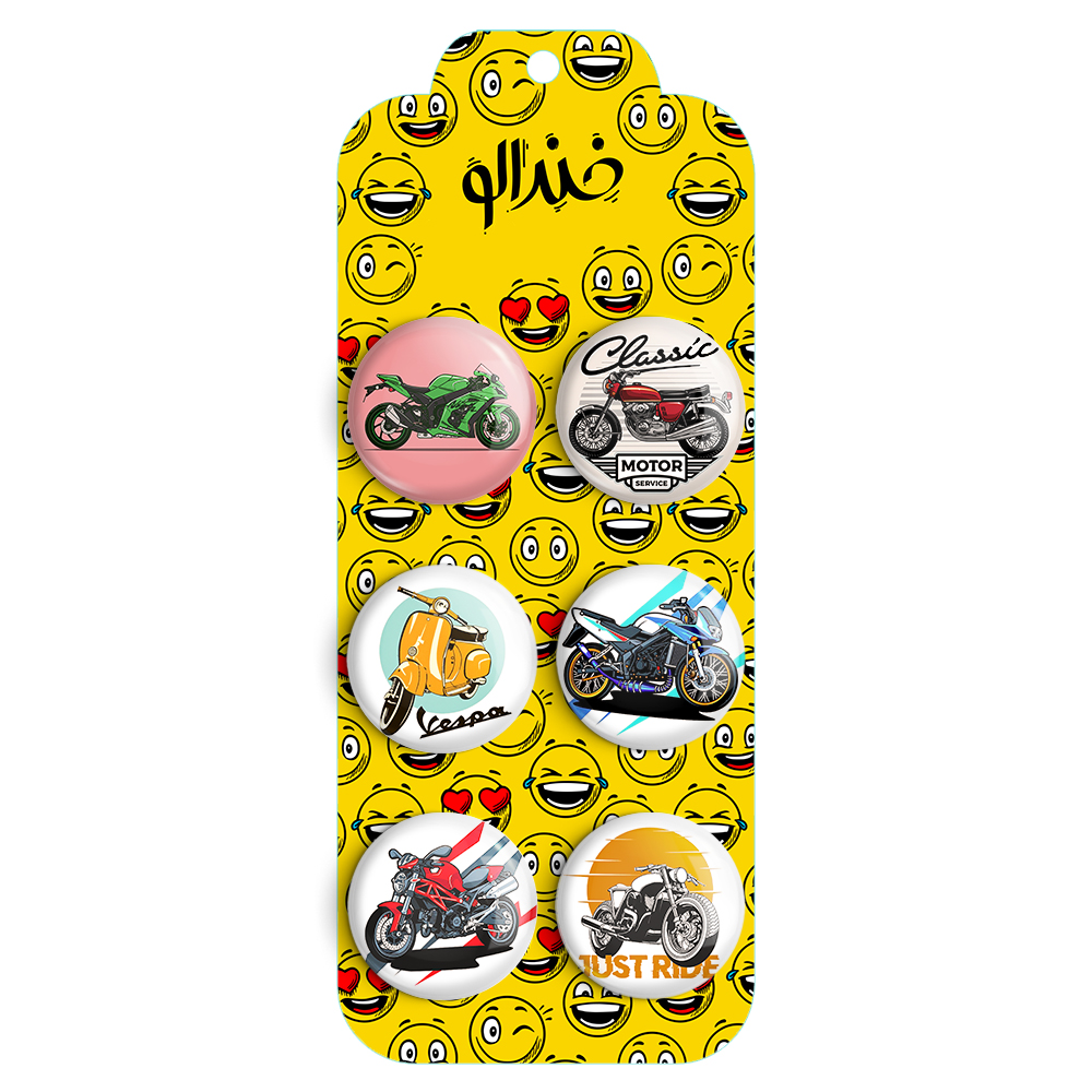مجموعه 6 عددی پیکسل خندالو طرح موتور سیکلت با روکش سلفون حرارتی براق ضدخش و قطعه پشتی رنگی تولید شده است. قطعات پشتی از میان 6 رنگ سفید، مشکی، صورتی، زرد، آبی و قرمز که با توجه به نوع و رنگبندی طرح روی پیکسل انتخاب شده اند تولید می شود و در هر بسته بندی مطابق عکس محصول می باشد.