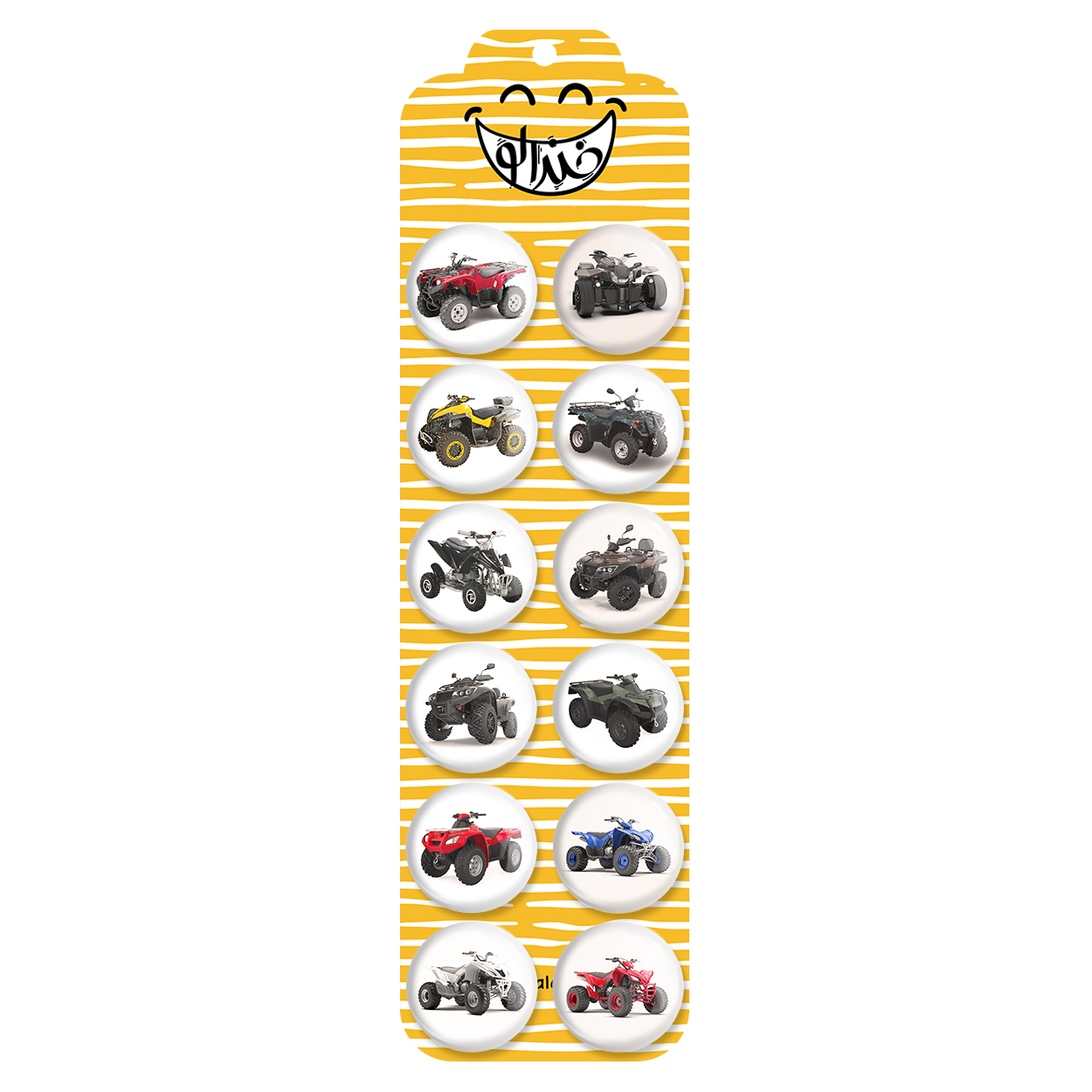 پک 12 عددی پیکسل خندالو طرح موتور چهار چرخ با روکش سلفون حرارتی براق ضدخش و قطعه پشتی رنگی تولید شده است. قطعات پشتی از میان 6 رنگ سفید، مشکی، صورتی، زرد، آبی و قرمز که با توجه به نوع و رنگبندی طرح روی پیکسل انتخاب شده اند تولید می شود و در هر بسته بندی مطابق عکس محصول می باشد. قطعات پلاستیکی پشت پیکسل با سوزن یک تکه ثابت و بدون لغزش و جا به جایی، ایستایی بسیار بهتری نسبت به پشتی فلزی پیکسل دارند که این مهم در تولید این محصول نیز رعایت شده است.