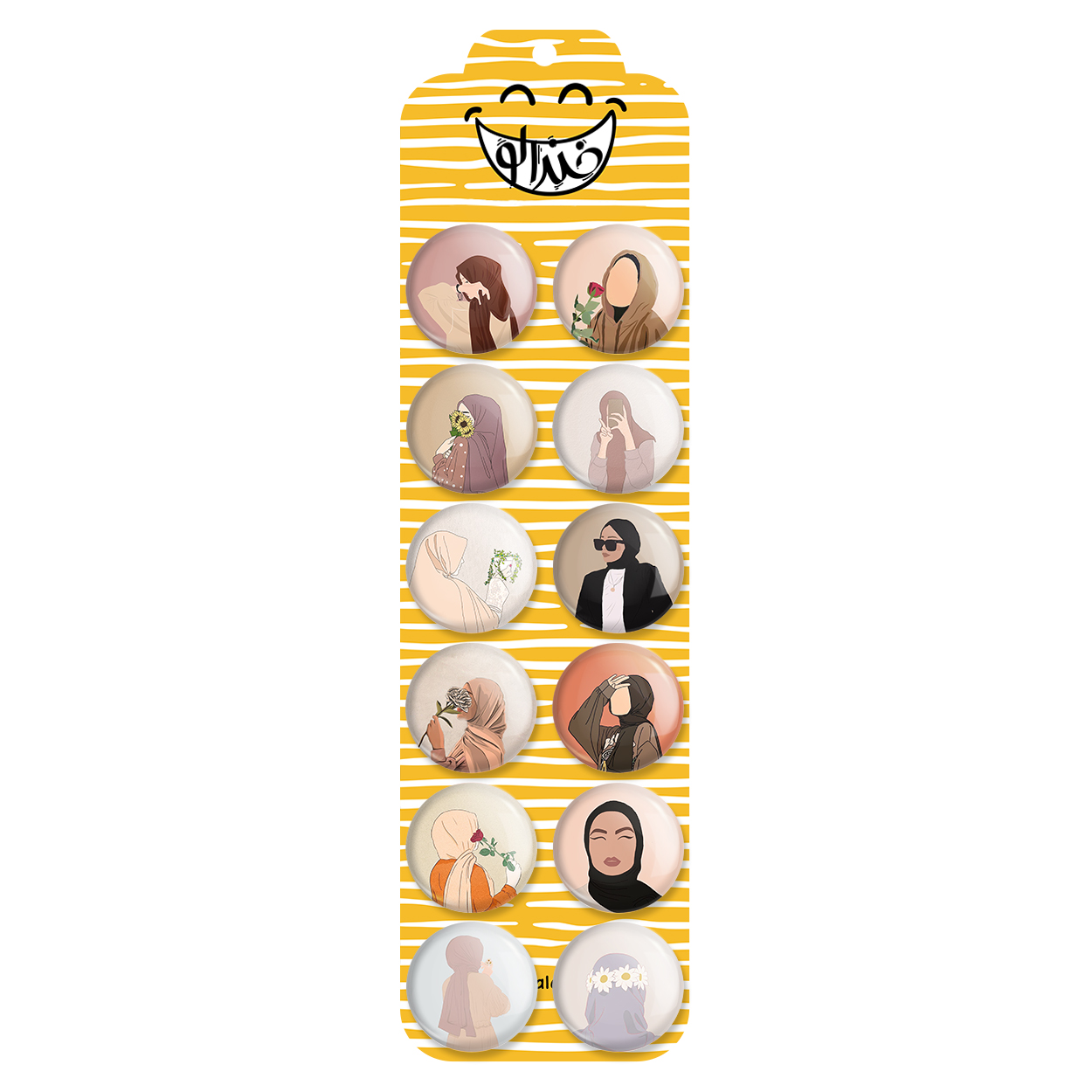 پک 12 عددی پیکسل خندالو طرح مینیمال با حجاب با روکش سلفون حرارتی براق ضدخش و قطعه پشتی رنگی تولید شده است. قطعات پشتی از میان 6 رنگ سفید، مشکی، صورتی، زرد، آبی و قرمز که با توجه به نوع و رنگبندی طرح روی پیکسل انتخاب شده اند تولید می شود و در هر بسته بندی مطابق عکس محصول می باشد. قطعات پلاستیکی پشت پیکسل با سوزن یک تکه ثابت و بدون لغزش و جا به جایی، ایستایی بسیار بهتری نسبت به پشتی فلزی پیکسل دارند که این مهم در تولید این محصول نیز رعایت شده است. چاپ پیکسل طرح مینیمال با حجاب بسته ۱۲ عددی نیز با دستگاه های استاندارد و با بهترین سطح کیفی صورت گرفته و طرح با شفافیتی مثال زدنی و با سلفونی بدون شکست نور بر روی پیکسل نقش بسته است.