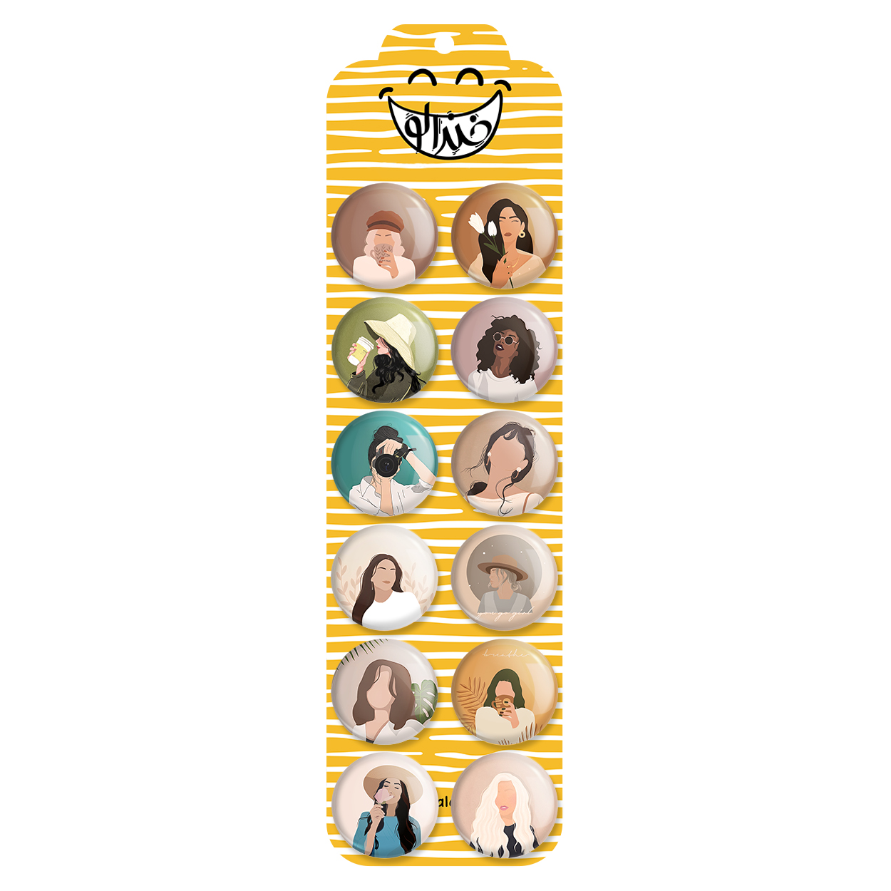 پک 12 عددی پیکسل خندالو طرح مینیمال با حجاب با روکش سلفون حرارتی براق ضدخش و قطعه پشتی رنگی تولید شده است. قطعات پشتی از میان 6 رنگ سفید، مشکی، صورتی، زرد، آبی و قرمز که با توجه به نوع و رنگبندی طرح روی پیکسل انتخاب شده اند تولید می شود و در هر بسته بندی مطابق عکس محصول می باشد. قطعات پلاستیکی پشت پیکسل با سوزن یک تکه ثابت و بدون لغزش و جا به جایی، ایستایی بسیار بهتری نسبت به پشتی فلزی پیکسل دارند که این مهم در تولید این محصول نیز رعایت شده است.
