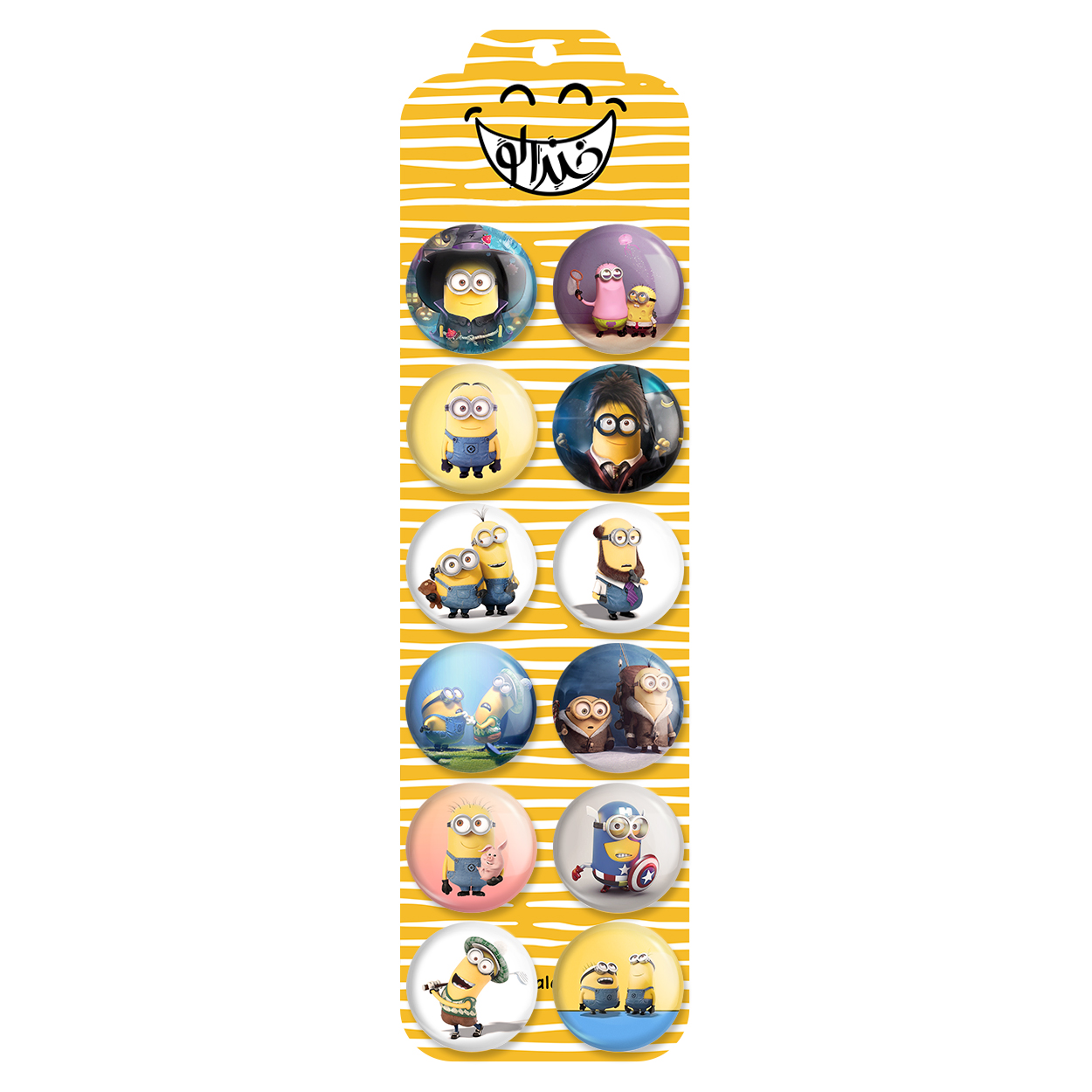 پک 12 عددی پیکسل خندالو طرح مینیون ها (Minions) با روکش سلفون حرارتی براق ضدخش و قطعه پشتی رنگی تولید شده است. قطعات پشتی از میان 6 رنگ سفید، مشکی، صورتی، زرد، آبی و قرمز که با توجه به نوع و رنگبندی طرح روی پیکسل انتخاب شده اند تولید می شود و در هر بسته بندی مطابق عکس محصول می باشد. قطعات پلاستیکی پشت پیکسل با سوزن یک تکه ثابت و بدون لغزش و جا به جایی، ایستایی بسیار بهتری نسبت به پشتی فلزی پیکسل دارند که این مهم در تولید این محصول نیز رعایت شده است. چاپ پیکسل طرح مینیون ها (Minions) بسته ۱۲ عددی نیز با دستگاه های استاندارد و با بهترین سطح کیفی صورت گرفته و طرح با شفافیتی مثال زدنی و با سلفونی بدون شکست نور بر روی پیکسل نقش بسته است.