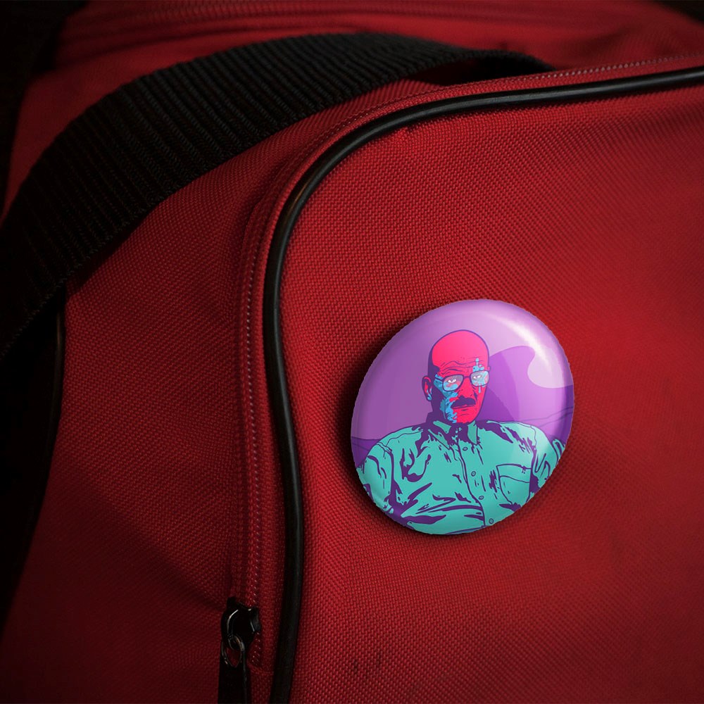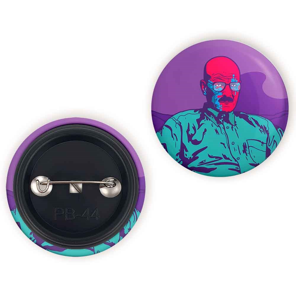 پیکسل 44 میلی متری والتر وایت سریال بریکینگ بد Breaking Bad خندالو با روکش سلفون حرارتی مات مخملی ضدخش و قطعه پشتی رنگی تولید شده است.پلاستیکی پشت پیکسل با سوزن یک تکه ثابت و بدون لغزش و جا به جایی، ایستایی بسیار بهتری نسبت به پشتی فلزی پیکسل دارند که این مهم در تولید این محصول نیز رعایت شده است.