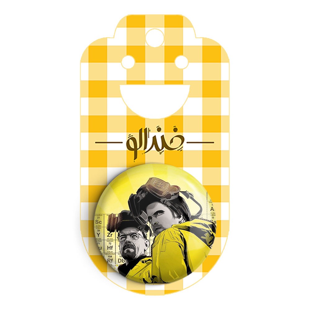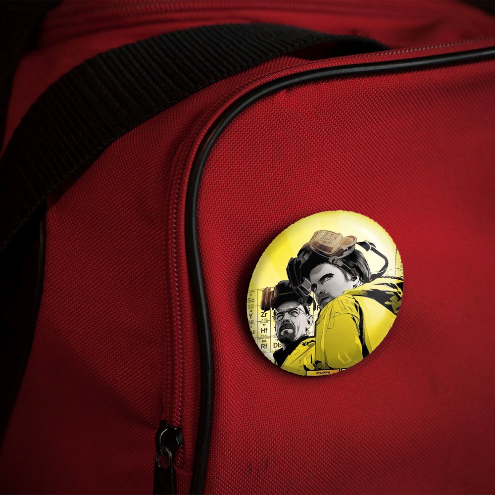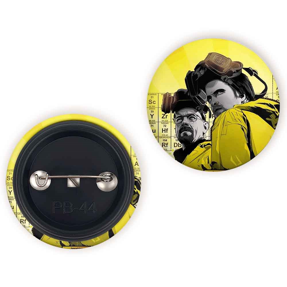 پیکسل 44 میلی متری والتر وایت و جسی پینکمن سریال بریکینگ بد Breaking Bad خندالو با روکش سلفون حرارتی مات مخملی ضدخش و قطعه پشتی رنگی تولید شده است.پلاستیکی پشت پیکسل با سوزن یک تکه ثابت و بدون لغزش و جا به جایی، ایستایی بسیار بهتری نسبت به پشتی فلزی پیکسل دارند که این مهم در تولید این محصول نیز رعایت شده است.