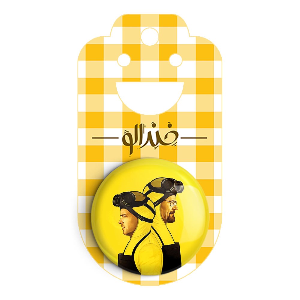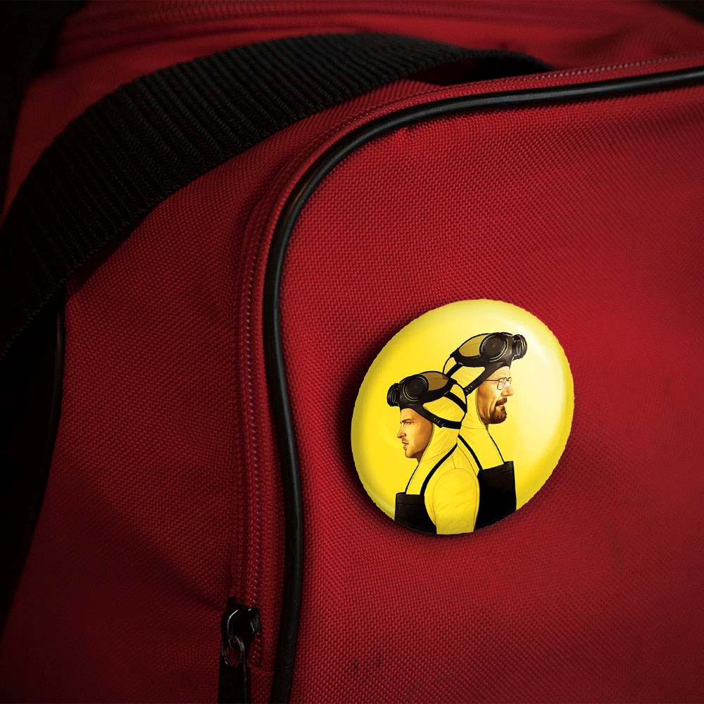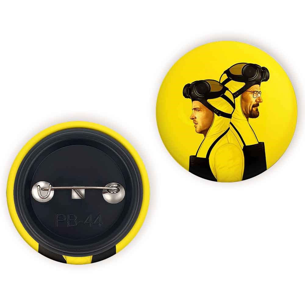 پیکسل 44 میلی متری والتر وایت و جسی پینکمن سریال بریکینگ بد Breaking Bad خندالو با روکش سلفون حرارتی مات مخملی ضدخش و قطعه پشتی رنگی تولید شده است.پلاستیکی پشت پیکسل با سوزن یک تکه ثابت و بدون لغزش و جا به جایی، ایستایی بسیار بهتری نسبت به پشتی فلزی پیکسل دارند که این مهم در تولید این محصول نیز رعایت شده است.