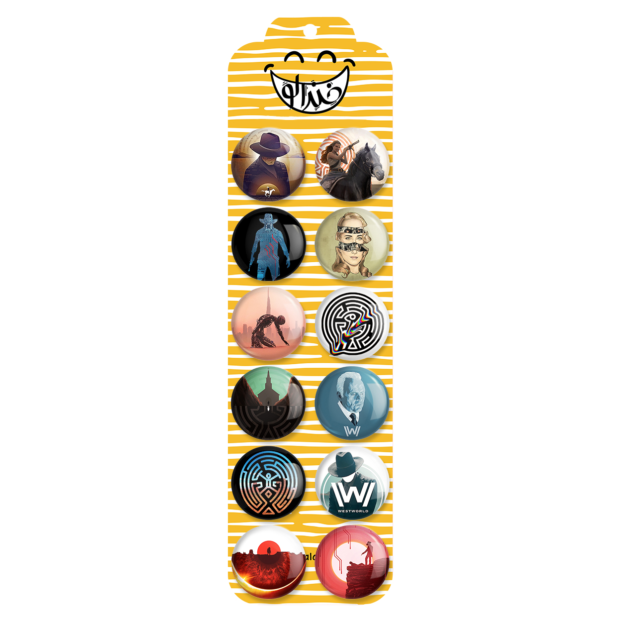 پک 12 عددی پیکسل خندالو طرح وست ورلد (Westworld) با روکش سلفون حرارتی براق ضدخش و قطعه پشتی رنگی تولید شده است. قطعات پشتی از میان 6 رنگ سفید، مشکی، صورتی، زرد، آبی و قرمز که با توجه به نوع و رنگبندی طرح روی پیکسل انتخاب شده اند تولید می شود و در هر بسته بندی مطابق عکس محصول می باشد. قطعات پلاستیکی پشت پیکسل با سوزن یک تکه ثابت و بدون لغزش و جا به جایی، ایستایی بسیار بهتری نسبت به پشتی فلزی پیکسل دارند که این مهم در تولید این محصول نیز رعایت شده است. چاپ پیکسل طرح وست ورلد (Westworld) بسته ۱۲ عددی نیز با دستگاه های استاندارد و با بهترین سطح کیفی صورت گرفته و طرح با شفافیتی مثال زدنی و با سلفونی بدون شکست نور بر روی پیکسل نقش بسته است.