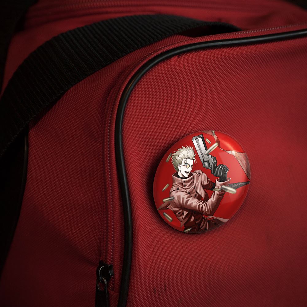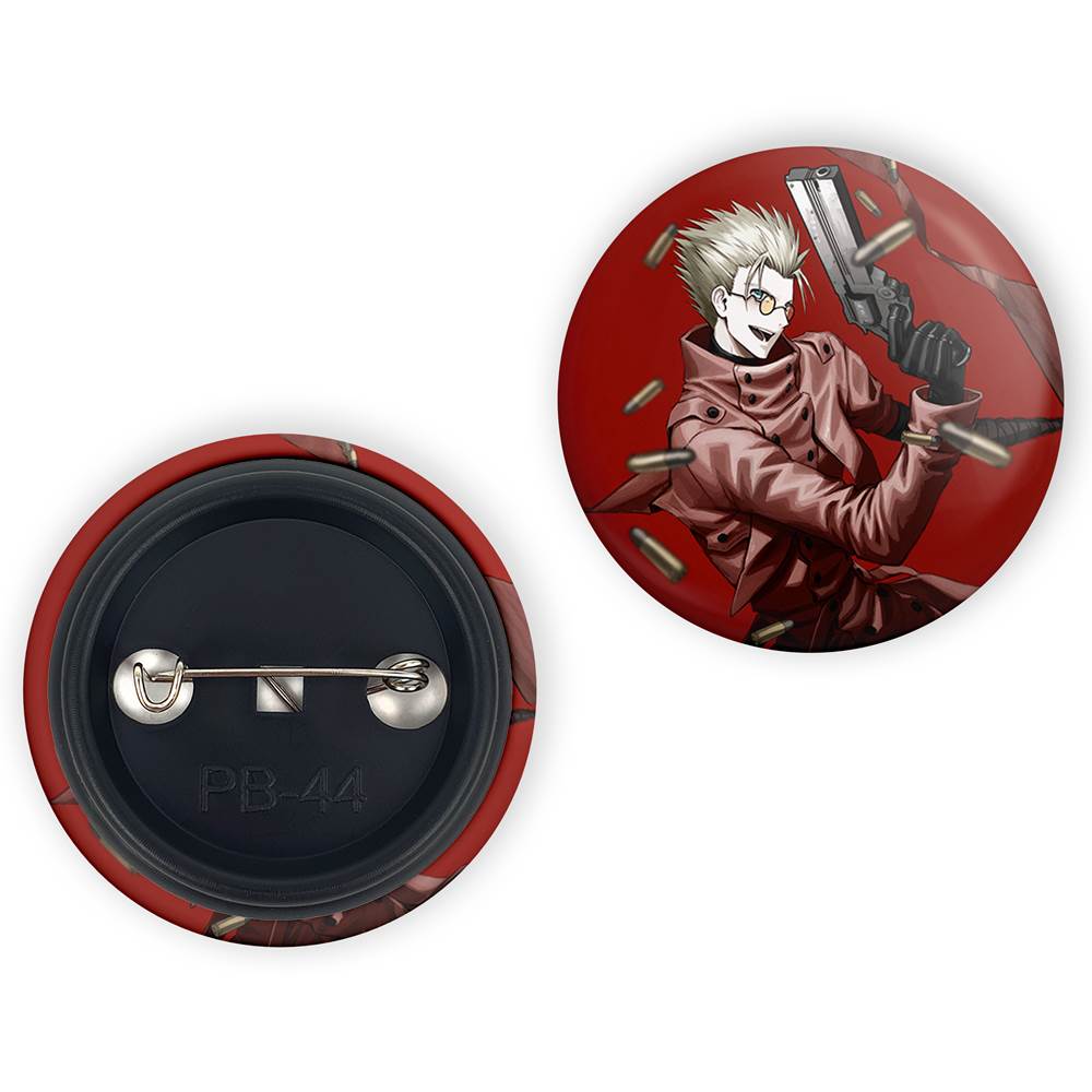 پیکسل 44 میلی متری وش انیمه تریگان (Trigun)خندالو با روکش سلفون حرارتی مات مخملی ضدخش و قطعه پشتی رنگی تولید شده است. قطعات پلاستیکی پشت پیکسل با سوزن یک تکه ثابت و بدون لغزش و جا به جایی، ایستایی بسیار بهتری نسبت به پشتی فلزی پیکسل دارند که این مهم در تولید این محصول نیز رعایت شده است.