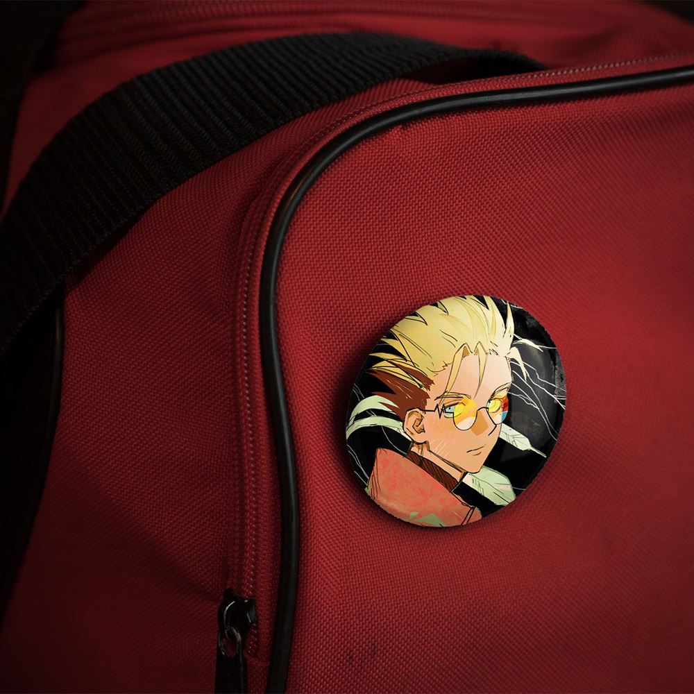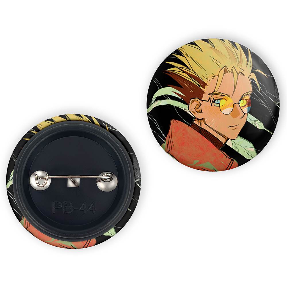 پیکسل 44 میلی متری وش انیمه تریگان (Trigun)خندالو با روکش سلفون حرارتی مات مخملی ضدخش و قطعه پشتی رنگی تولید شده است. قطعات پلاستیکی پشت پیکسل با سوزن یک تکه ثابت و بدون لغزش و جا به جایی، ایستایی بسیار بهتری نسبت به پشتی فلزی پیکسل دارند که این مهم در تولید این محصول نیز رعایت شده است.