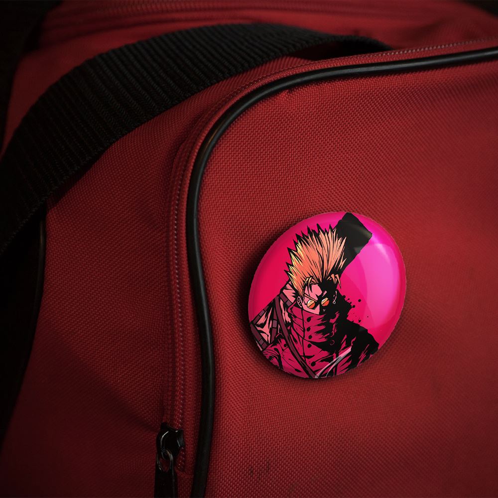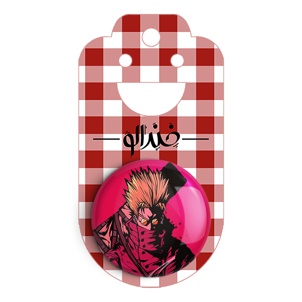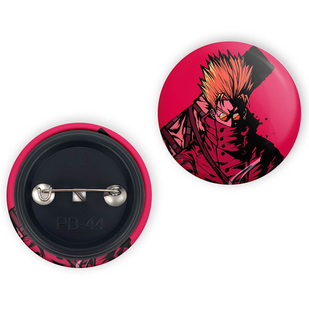پیکسل 44 میلی متری وش انیمه تریگان (Trigun)خندالو با روکش سلفون حرارتی مات مخملی ضدخش و قطعه پشتی رنگی تولید شده است. قطعات پلاستیکی پشت پیکسل با سوزن یک تکه ثابت و بدون لغزش و جا به جایی، ایستایی بسیار بهتری نسبت به پشتی فلزی پیکسل دارند که این مهم در تولید این محصول نیز رعایت شده است.