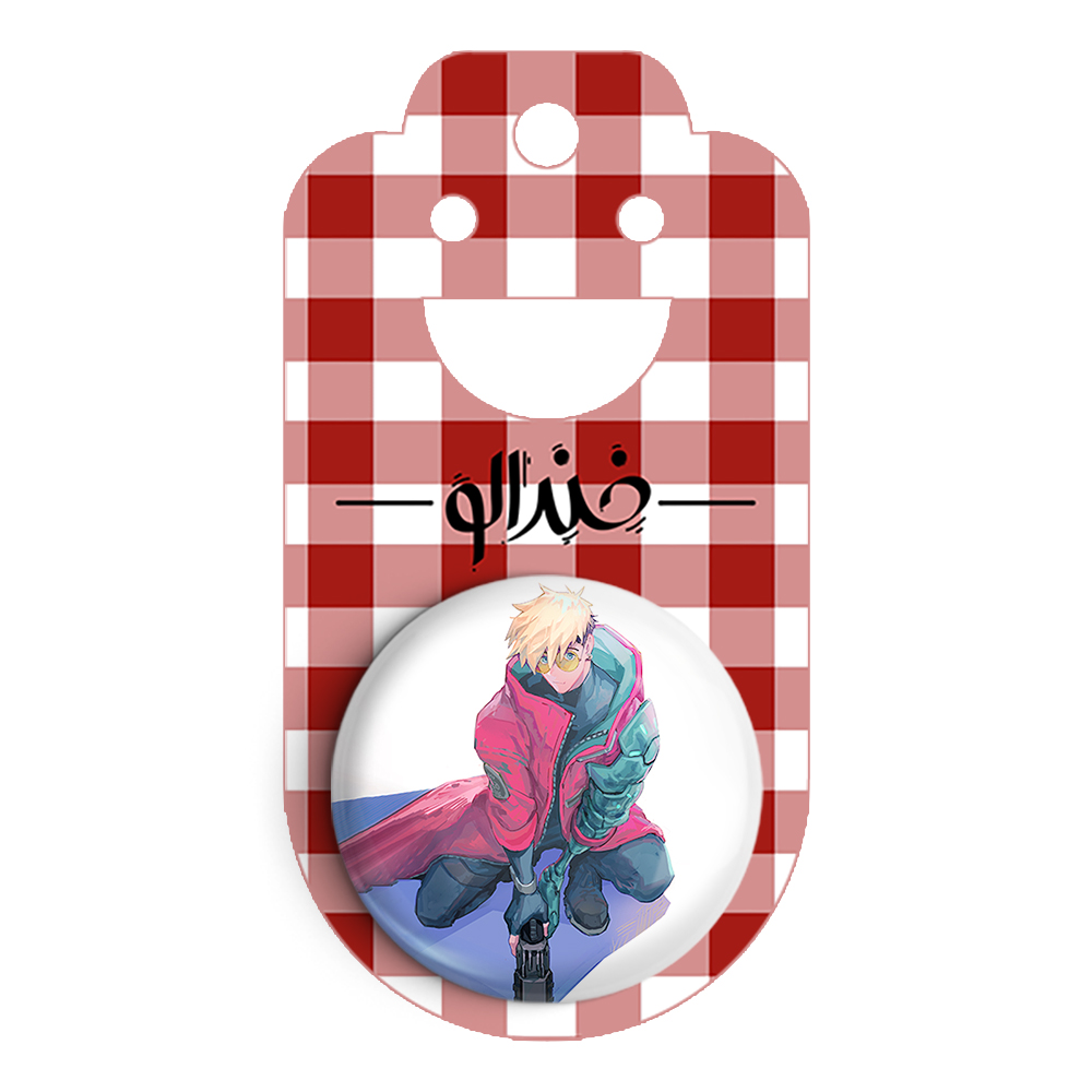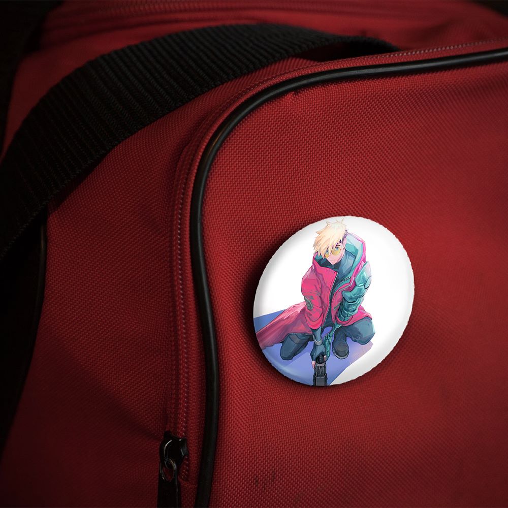 پیکسل 44 میلی متری وش انیمه تریگان (Trigun)خندالو با روکش سلفون حرارتی مات مخملی ضدخش و قطعه پشتی رنگی تولید شده است. قطعات پلاستیکی پشت پیکسل با سوزن یک تکه ثابت و بدون لغزش و جا به جایی، ایستایی بسیار بهتری نسبت به پشتی فلزی پیکسل دارند که این مهم در تولید این محصول نیز رعایت شده است.