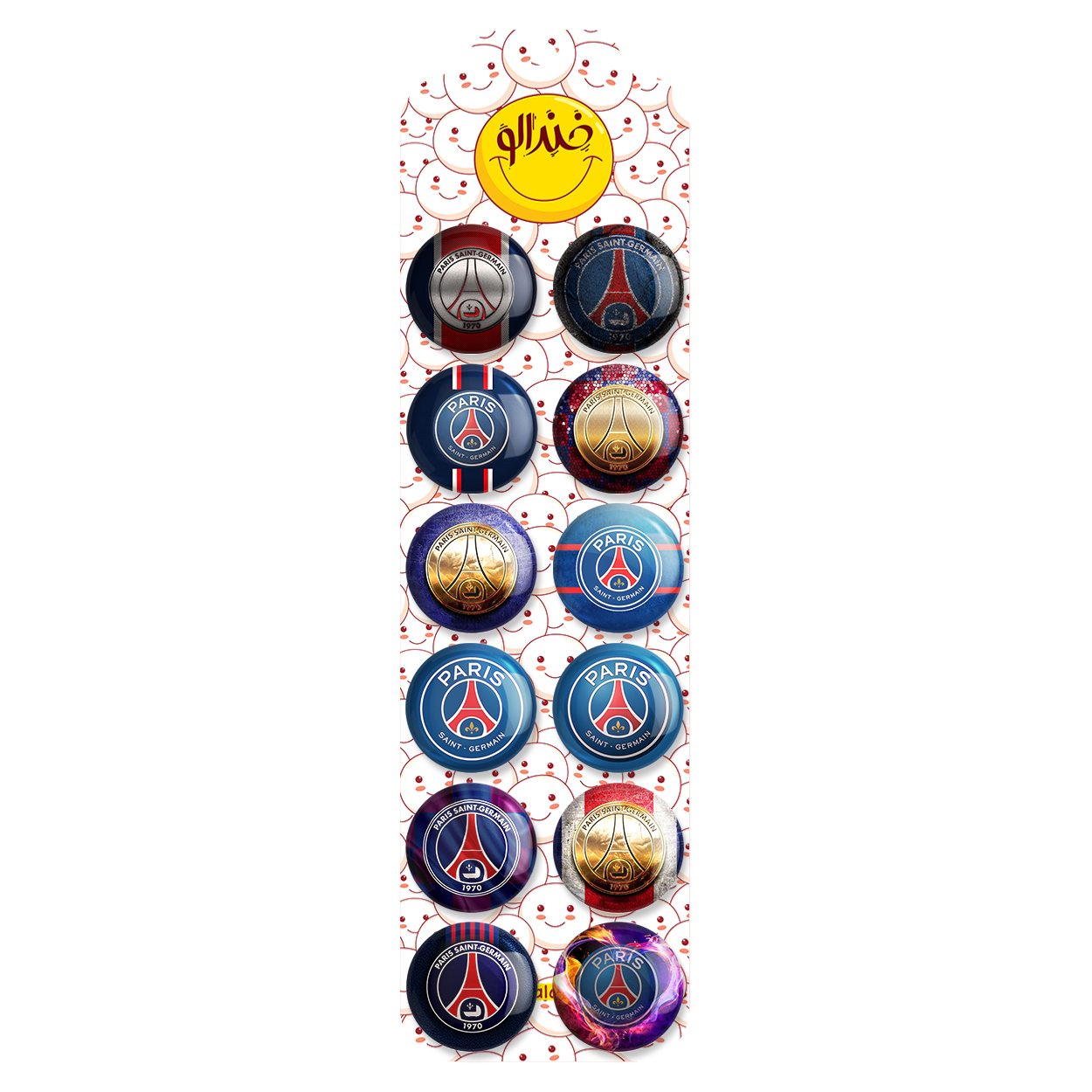 پک 12 عددی پیکسل خندالو طرح پاری سن ژرمن (Paris Saint Germain) با روکش سلفون حرارتی براق ضدخش و قطعه پشتی رنگی تولید شده است. قطعات پشتی از میان 6 رنگ سفید، مشکی، صورتی، زرد، آبی و قرمز که با توجه به نوع و رنگبندی طرح روی پیکسل انتخاب شده اند تولید می شود و در هر بسته بندی مطابق عکس محصول می باشد. قطعات پلاستیکی پشت پیکسل با سوزن یک تکه ثابت و بدون لغزش و جا به جایی، ایستایی بسیار بهتری نسبت به پشتی فلزی پیکسل دارند که این مهم در تولید این محصول نیز رعایت شده است.