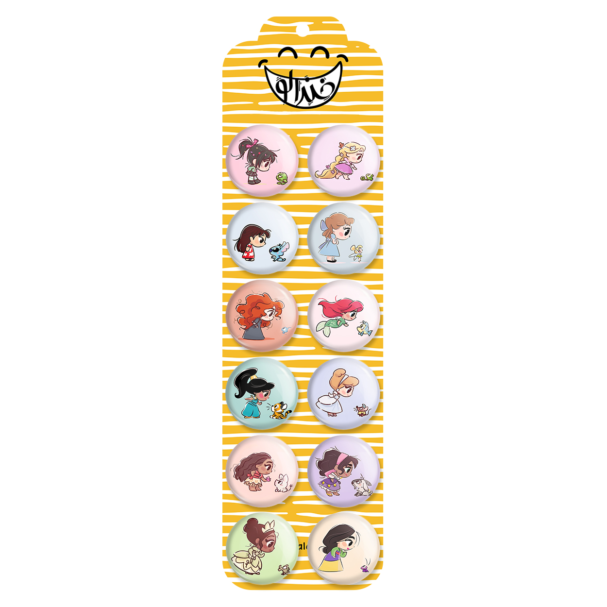 پک 12 عددی پیکسل خندالو طرح پرنسس های دیزنی با روکش سلفون حرارتی براق ضدخش و قطعه پشتی رنگی تولید شده است. قطعات پشتی از میان 6 رنگ سفید، مشکی، صورتی، زرد، آبی و قرمز که با توجه به نوع و رنگبندی طرح روی پیکسل انتخاب شده اند تولید می شود و در هر بسته بندی مطابق عکس محصول می باشد. قطعات پلاستیکی پشت پیکسل با سوزن یک تکه ثابت و بدون لغزش و جا به جایی، ایستایی بسیار بهتری نسبت به پشتی فلزی پیکسل دارند که این مهم در تولید این محصول نیز رعایت شده است. چاپ پیکسل طرح پرنسس های دیزنی بسته ۱۲ عددی نیز با دستگاه های استاندارد و با بهترین سطح کیفی صورت گرفته و طرح با شفافیتی مثال زدنی و با سلفونی بدون شکست نور بر روی پیکسل نقش بسته است.