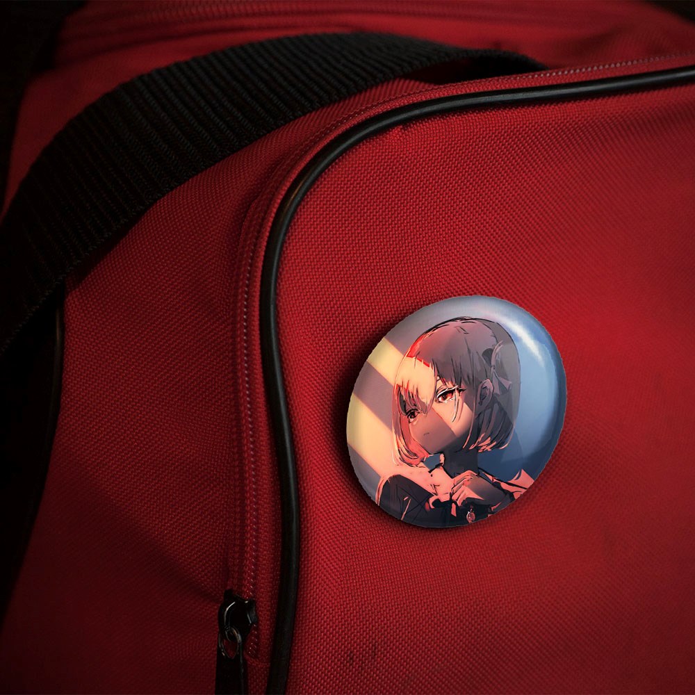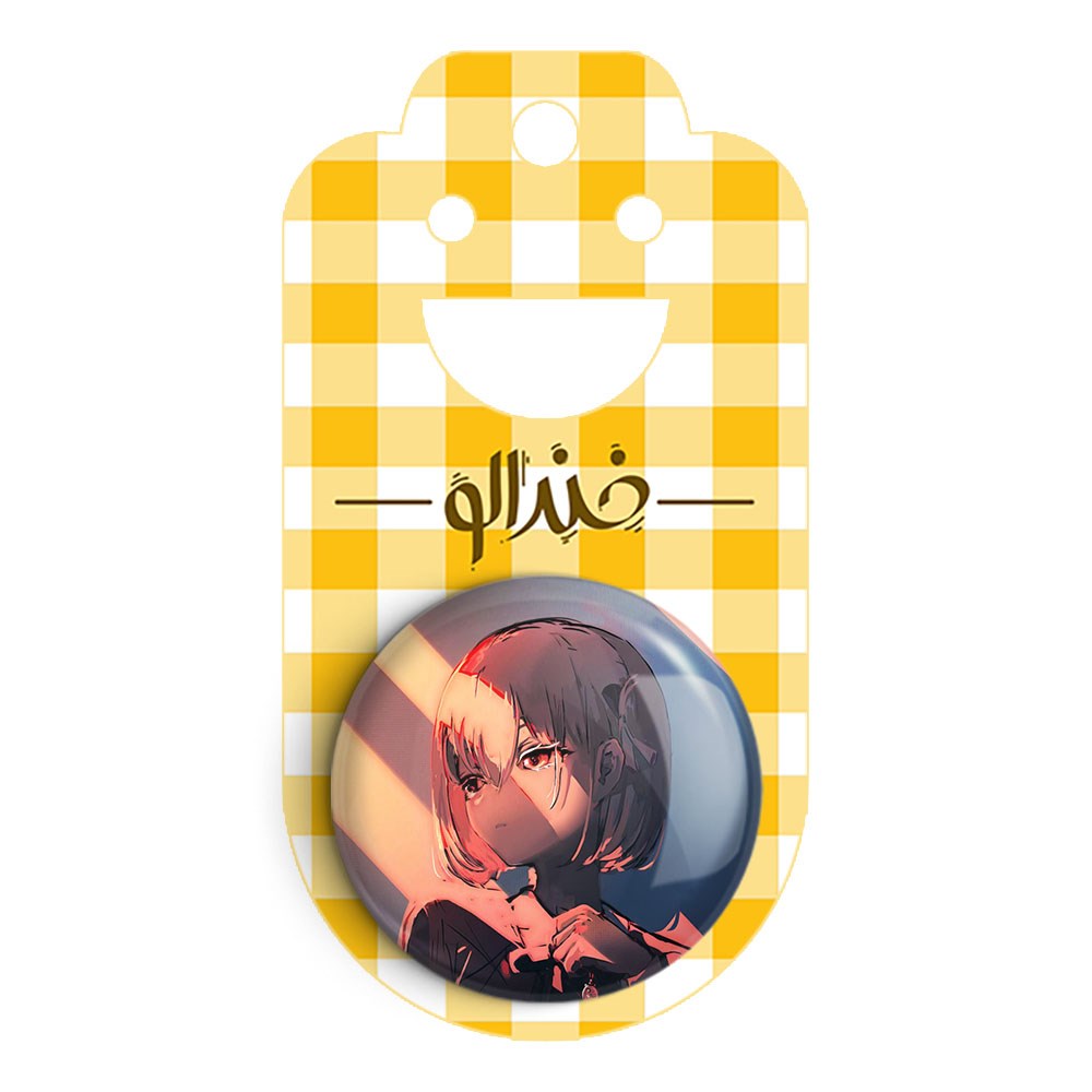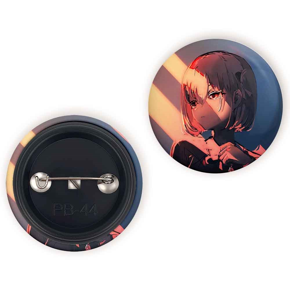 پیکسل 44 میلی متری چیساتو انیمه لیکوریس ریکویل Lycoris Recoil خندالو با روکش سلفون حرارتی مات مخملی ضدخش و قطعه پشتی رنگی تولید شده است.پلاستیکی پشت پیکسل با سوزن یک تکه ثابت و بدون لغزش و جا به جایی، ایستایی بسیار بهتری نسبت به پشتی فلزی پیکسل دارند که این مهم در تولید این محصول نیز رعایت شده است.