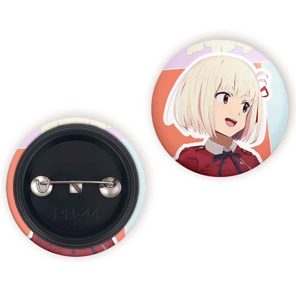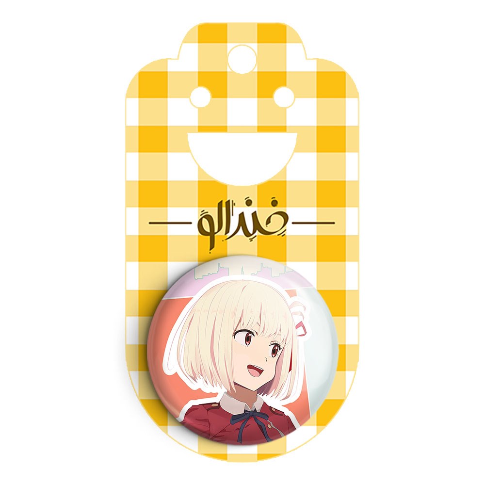 پیکسل 44 میلی متری چیساتو انیمه لیکوریس ریکویل Lycoris Recoil خندالو با روکش سلفون حرارتی مات مخملی ضدخش و قطعه پشتی رنگی تولید شده است.پلاستیکی پشت پیکسل با سوزن یک تکه ثابت و بدون لغزش و جا به جایی، ایستایی بسیار بهتری نسبت به پشتی فلزی پیکسل دارند که این مهم در تولید این محصول نیز رعایت شده است.