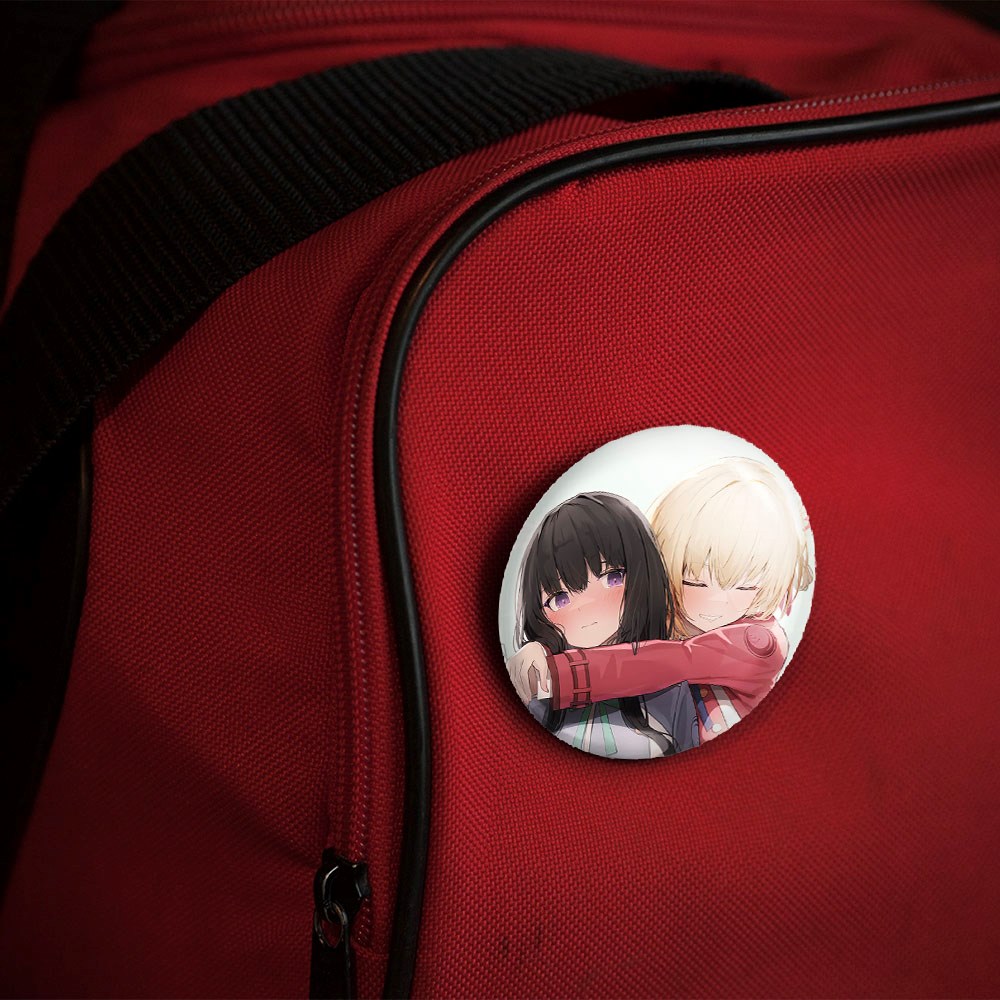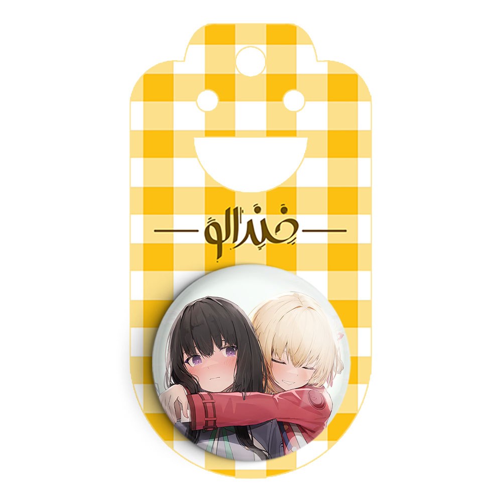 پیکسل 44 میلی متری چیساتو و تاکینا انیمه لیکوریس ریکویل Lycoris Recoil خندالو با روکش سلفون حرارتی مات مخملی ضدخش و قطعه پشتی رنگی تولید شده است.پلاستیکی پشت پیکسل با سوزن یک تکه ثابت و بدون لغزش و جا به جایی، ایستایی بسیار بهتری نسبت به پشتی فلزی پیکسل دارند که این مهم در تولید این محصول نیز رعایت شده است.