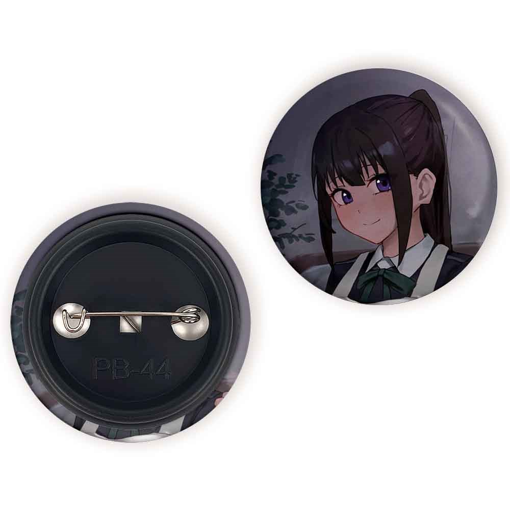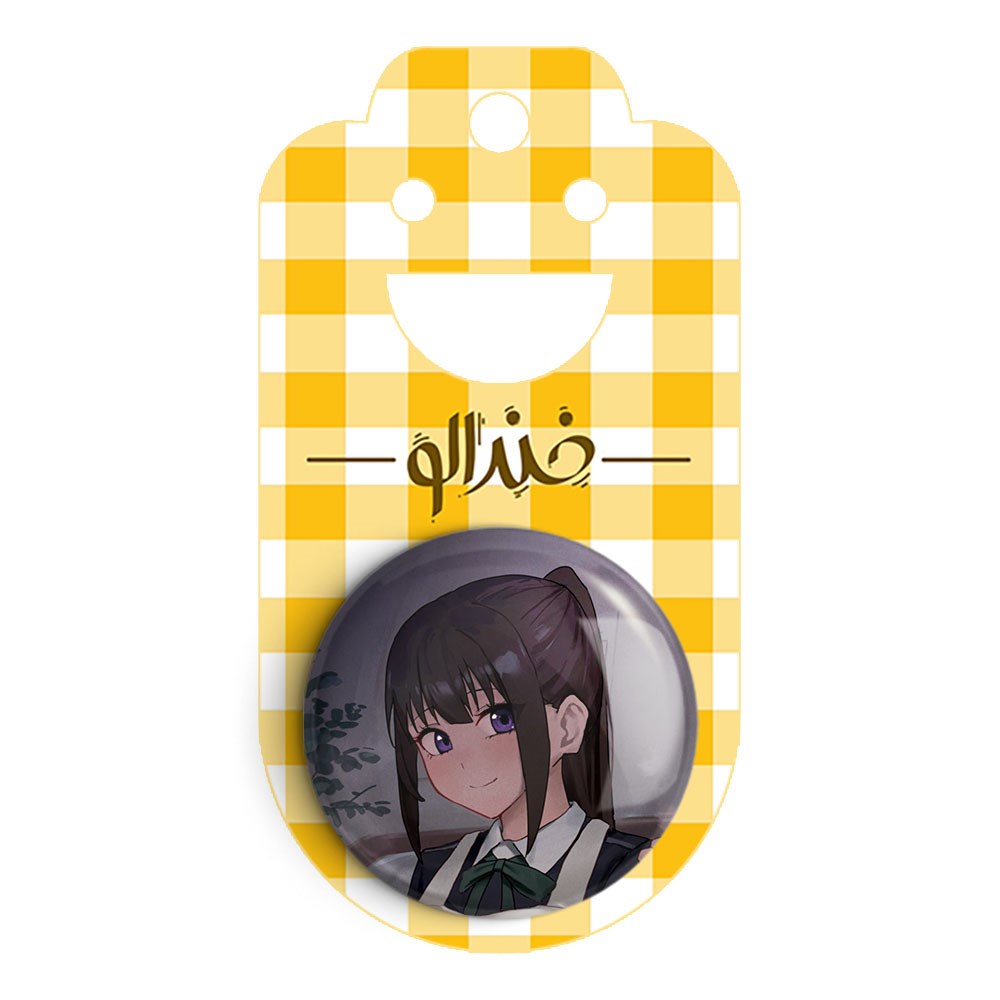 پیکسل 44 میلی متری چیساتو و تاکینا انیمه لیکوریس ریکویل Lycoris Recoil خندالو با روکش سلفون حرارتی مات مخملی ضدخش و قطعه پشتی رنگی تولید شده است.پلاستیکی پشت پیکسل با سوزن یک تکه ثابت و بدون لغزش و جا به جایی، ایستایی بسیار بهتری نسبت به پشتی فلزی پیکسل دارند که این مهم در تولید این محصول نیز رعایت شده است.