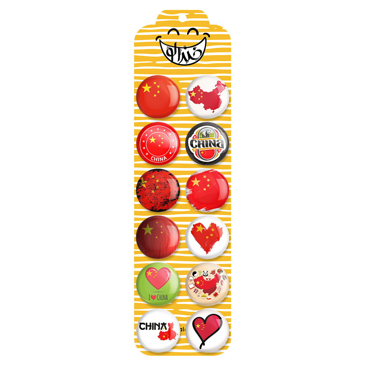 پک 12 عددی پیکسل خندالو طرح چین (China) با روکش سلفون حرارتی براق ضدخش و قطعه پشتی رنگی تولید شده است. قطعات پشتی از میان 6 رنگ سفید، مشکی، صورتی، زرد، آبی و قرمز که با توجه به نوع و رنگبندی طرح روی پیکسل انتخاب شده اند تولید می شود و در هر بسته بندی مطابق عکس محصول می باشد. قطعات پلاستیکی پشت پیکسل با سوزن یک تکه ثابت و بدون لغزش و جا به جایی، ایستایی بسیار بهتری نسبت به پشتی فلزی پیکسل دارند که این مهم در تولید این محصول نیز رعایت شده است. چاپ پیکسل طرح چین (China) بسته ۱۲ عددی نیز با دستگاه های استاندارد و با بهترین سطح کیفی صورت گرفته و طرح با شفافیتی مثال زدنی و با سلفونی بدون شکست نور بر روی پیکسل نقش بسته است.