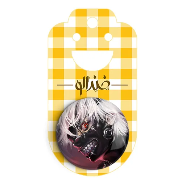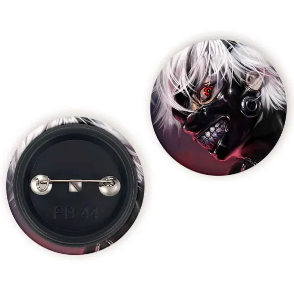 پیکسل 44 میلی متری کانکی کن انیمه توکیو غول Tokyo Ghoul خندالو با روکش سلفون حرارتی مات مخملی ضدخش و قطعه پشتی رنگی تولید شده است.پلاستیکی پشت پیکسل با سوزن یک تکه ثابت و بدون لغزش و جا به جایی، ایستایی بسیار بهتری نسبت به پشتی فلزی پیکسل دارند که این مهم در تولید این محصول نیز رعایت شده است.