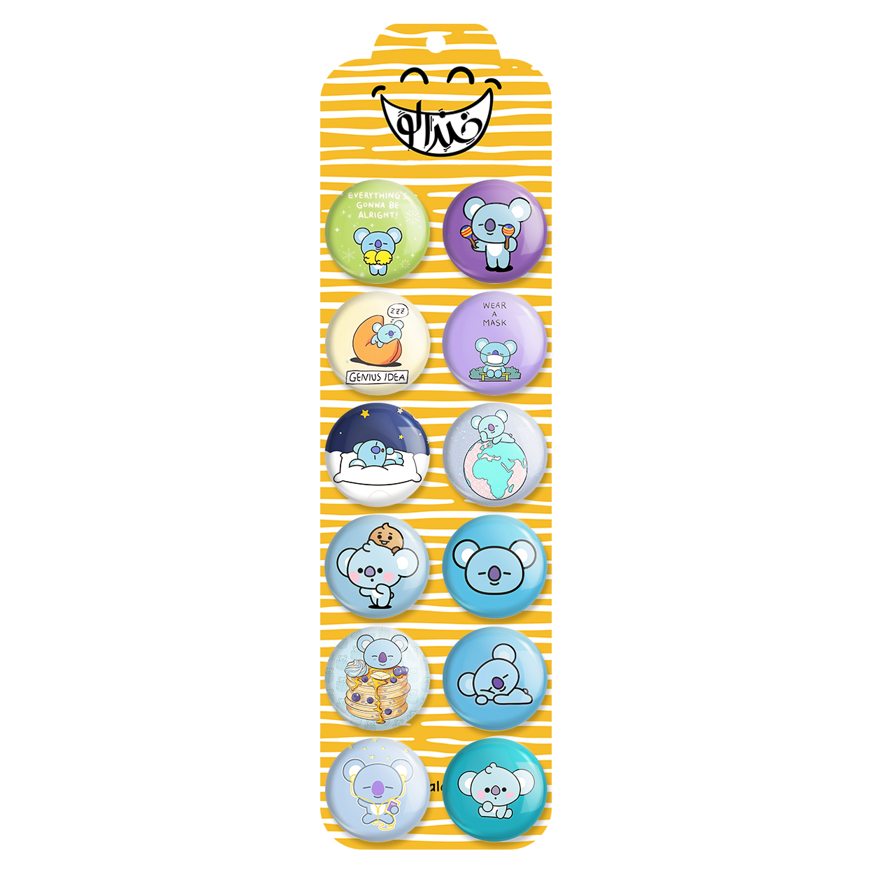 پک 12 عددی پیکسل خندالو طرح کویا BT21 Koya با روکش سلفون حرارتی براق ضدخش و قطعه پشتی رنگی تولید شده است. قطعات پشتی از میان 6 رنگ سفید، مشکی، صورتی، زرد، آبی و قرمز که با توجه به نوع و رنگبندی طرح روی پیکسل انتخاب شده اند تولید می شود و در هر بسته بندی مطابق عکس محصول می باشد. قطعات پلاستیکی پشت پیکسل با سوزن یک تکه ثابت و بدون لغزش و جا به جایی، ایستایی بسیار بهتری نسبت به پشتی فلزی پیکسل دارند که این مهم در تولید این محصول نیز رعایت شده است. چاپ پیکسل طرح کویا BT21 Koya بسته ۱۲ عددی نیز با دستگاه های استاندارد و با بهترین سطح کیفی صورت گرفته و طرح با شفافیتی مثال زدنی و با سلفونی بدون شکست نور بر روی پیکسل نقش بسته است.