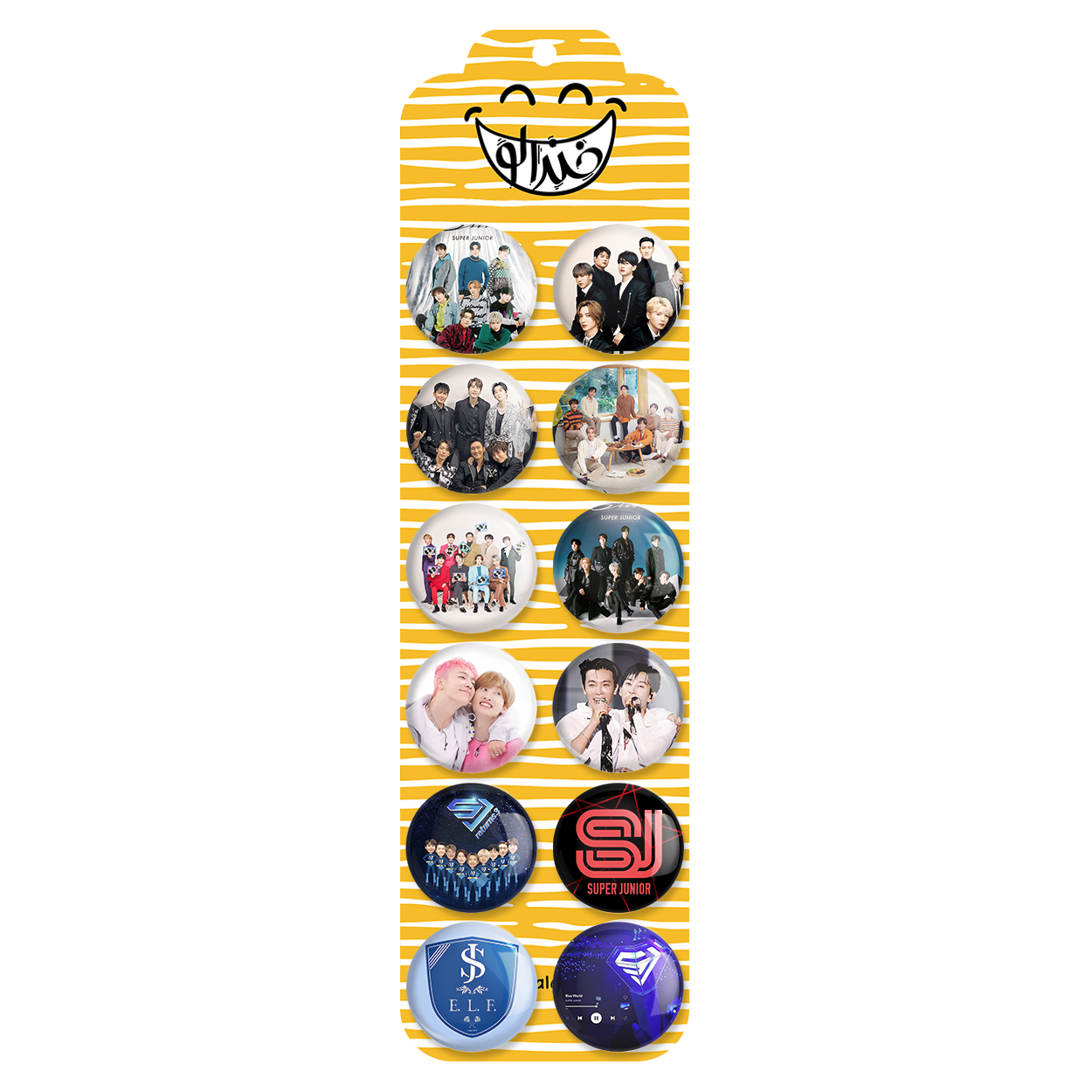پک 12 عددی پیکسل خندالو طرح گروهی سوپر جونیور (Super junior) با روکش سلفون حرارتی براق ضدخش و قطعه پشتی رنگی تولید شده است. قطعات پشتی از میان 6 رنگ سفید، مشکی، صورتی، زرد، آبی و قرمز که با توجه به نوع و رنگبندی طرح روی پیکسل انتخاب شده اند تولید می شود و در هر بسته بندی مطابق عکس محصول می باشد. قطعات پلاستیکی پشت پیکسل با سوزن یک تکه ثابت و بدون لغزش و جا به جایی، ایستایی بسیار بهتری نسبت به پشتی فلزی پیکسل دارند که این مهم در تولید این محصول نیز رعایت شده است. چاپ پیکسل طرح گروهی سوپر جونیور (Super junior) بسته ۱۲ عددی نیز با دستگاه های استاندارد و با بهترین سطح کیفی صورت گرفته و طرح با شفافیتی مثال زدنی و با سلفونی بدون شکست نور بر روی پیکسل نقش بسته است.