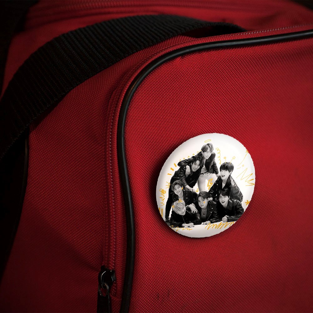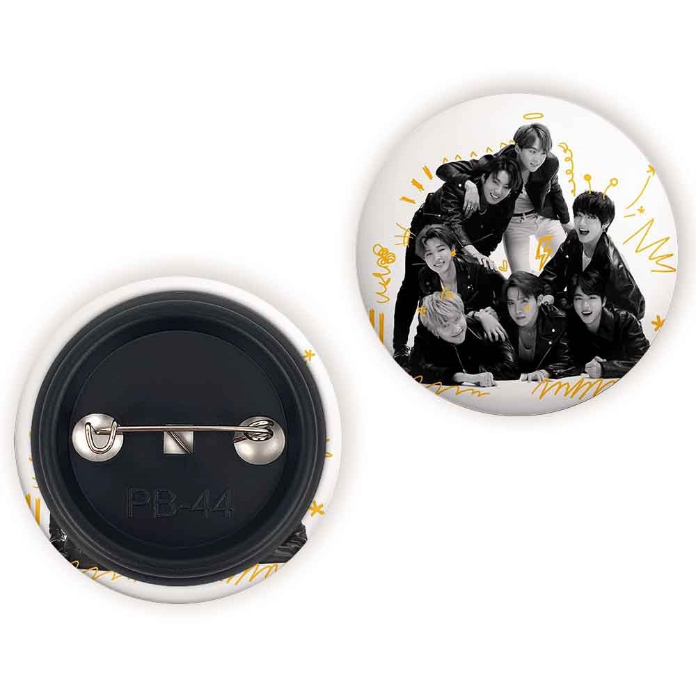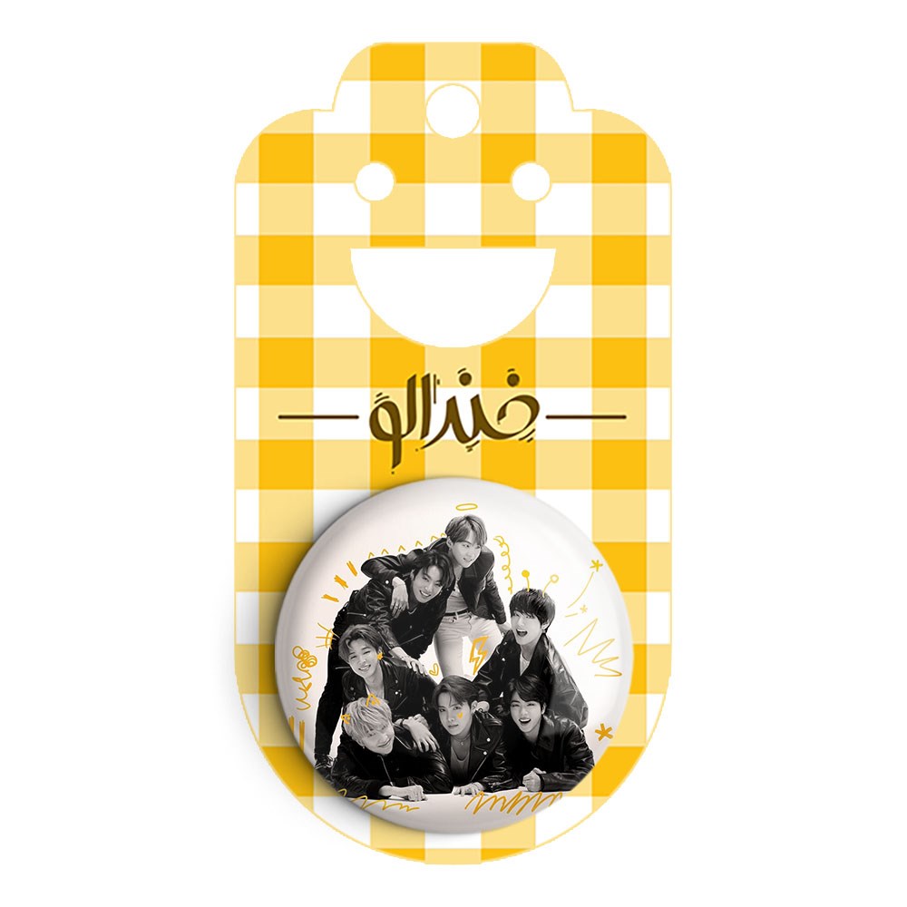 پیکسل 44 میلی متری گروه بی تی اس BTS خندالو با روکش سلفون حرارتی مات مخملی ضدخش و قطعه پشتی رنگی تولید شده است.پلاستیکی پشت پیکسل با سوزن یک تکه ثابت و بدون لغزش و جا به جایی، ایستایی بسیار بهتری نسبت به پشتی فلزی پیکسل دارند که این مهم در تولید این محصول نیز رعایت شده است.