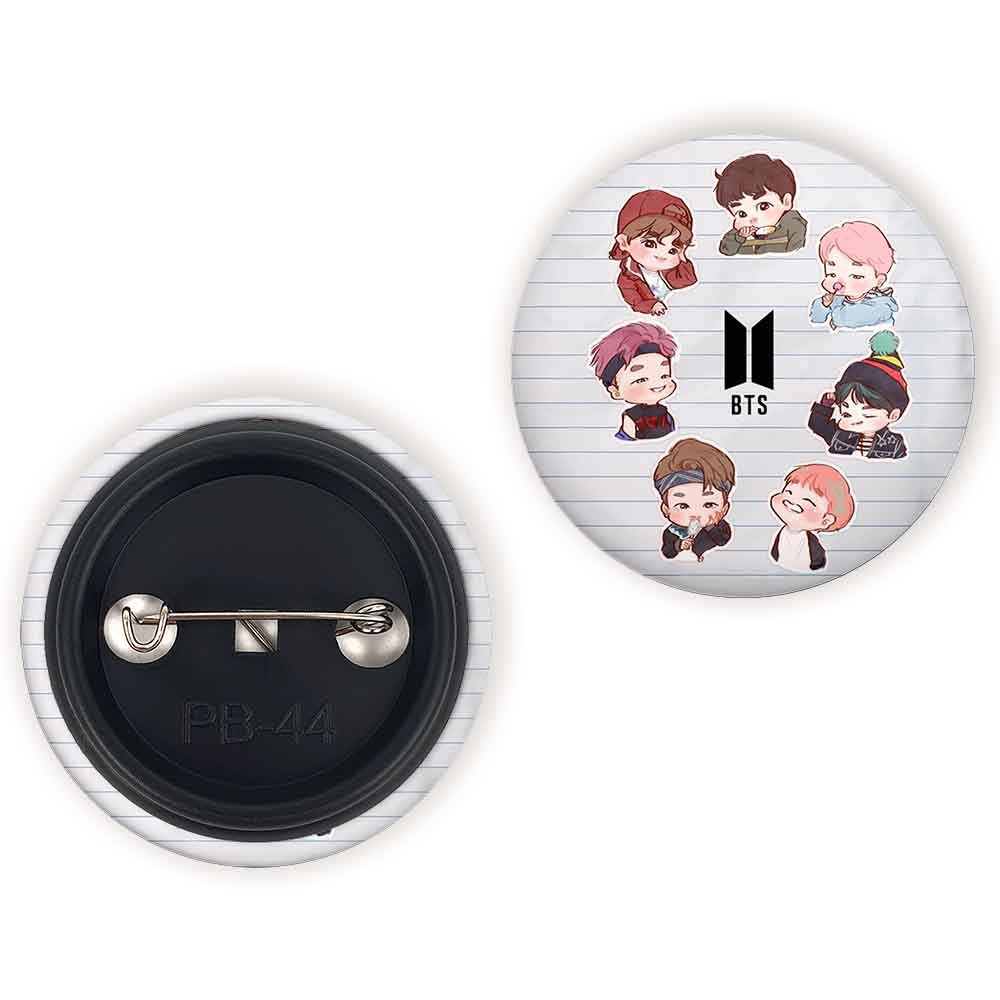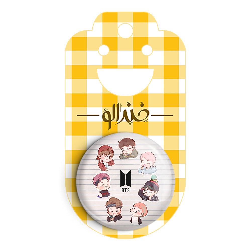 پیکسل 44 میلی متری گروه بی تی اس BTS خندالو با روکش سلفون حرارتی مات مخملی ضدخش و قطعه پشتی رنگی تولید شده است.پلاستیکی پشت پیکسل با سوزن یک تکه ثابت و بدون لغزش و جا به جایی، ایستایی بسیار بهتری نسبت به پشتی فلزی پیکسل دارند که این مهم در تولید این محصول نیز رعایت شده است.