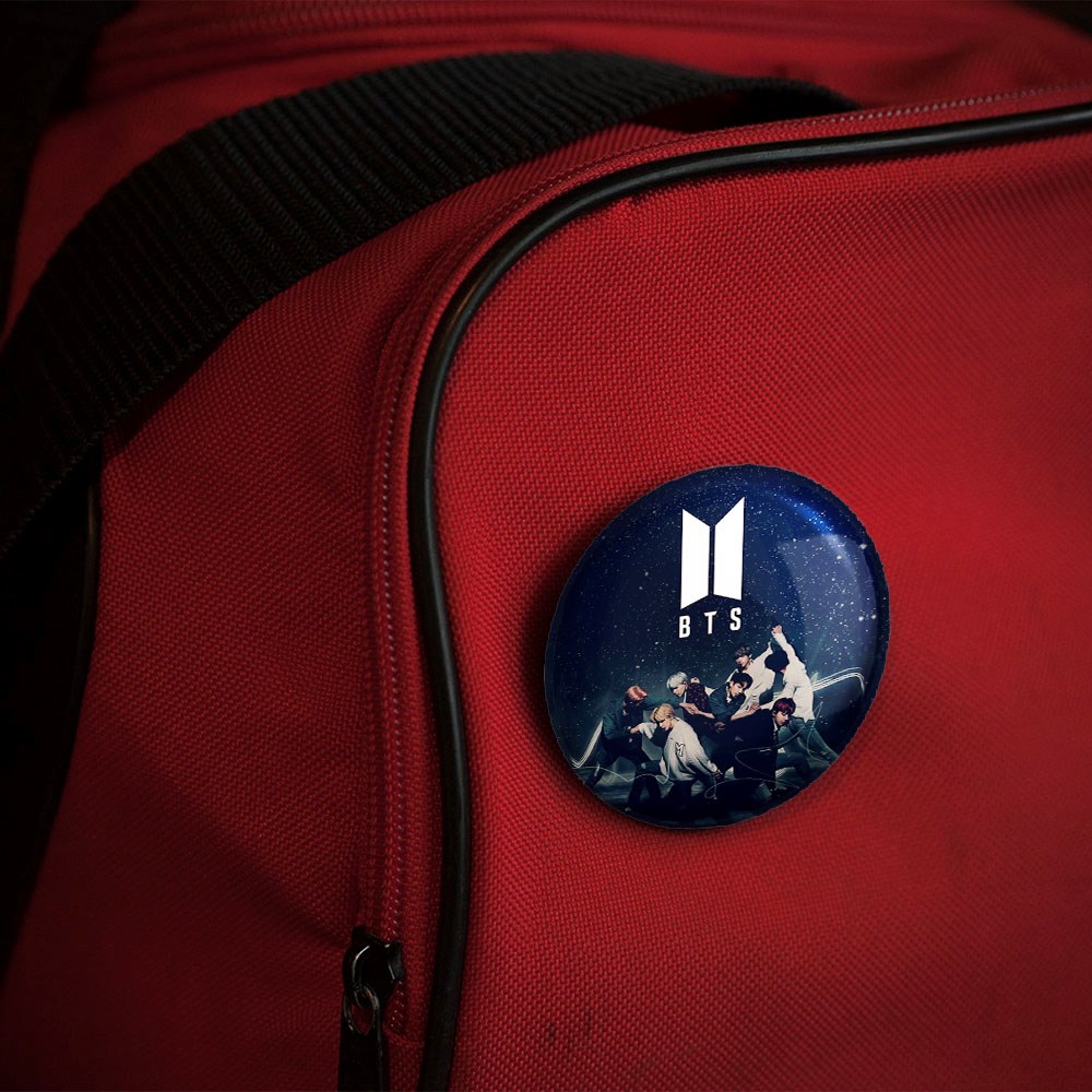 پیکسل 44 میلی متری گروه بی تی اس BTS خندالو با روکش سلفون حرارتی مات مخملی ضدخش و قطعه پشتی رنگی تولید شده است.پلاستیکی پشت پیکسل با سوزن یک تکه ثابت و بدون لغزش و جا به جایی، ایستایی بسیار بهتری نسبت به پشتی فلزی پیکسل دارند که این مهم در تولید این محصول نیز رعایت شده است.