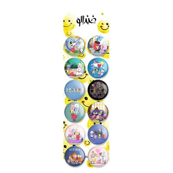 پک 12 عددی پیکسل خندالو طرح گروه BT21 با روکش سلفون حرارتی براق ضدخش و قطعه پشتی رنگی تولید شده است. قطعات پشتی از میان 6 رنگ سفید، مشکی، صورتی، زرد، آبی و قرمز که با توجه به نوع و رنگبندی طرح روی پیکسل انتخاب شده اند تولید می شود و در هر بسته بندی مطابق عکس محصول می باشد. قطعات پلاستیکی پشت پیکسل با سوزن یک تکه ثابت و بدون لغزش و جا به جایی، ایستایی بسیار بهتری نسبت به پشتی فلزی پیکسل دارند که این مهم در تولید این محصول نیز رعایت شده است. چاپ پیکسل طرح گروه BT21 بسته ۱۲ عددی نیز با دستگاه های استاندارد و با بهترین سطح کیفی صورت گرفته و طرح با شفافیتی مثال زدنی و با سلفونی بدون شکست نور بر روی پیکسل نقش بسته است.