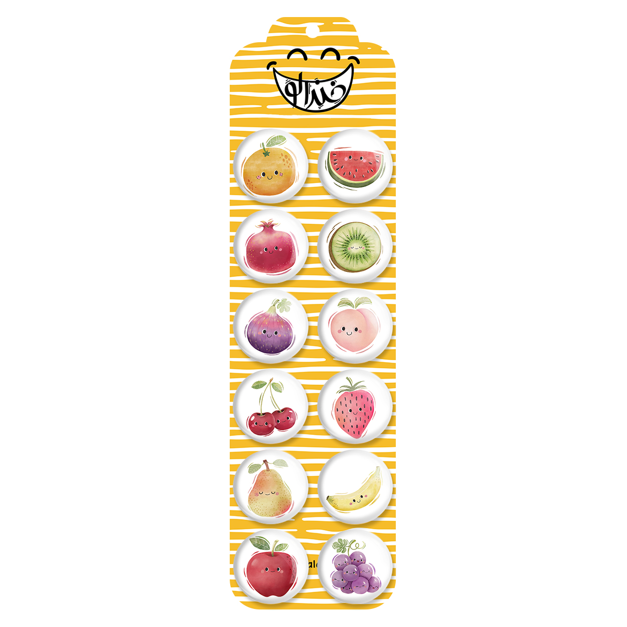 پک 12 عددی پیکسل خندالو طرح یخچالی میوه با روکش سلفون حرارتی براق ضدخش و قطعه پشتی رنگی تولید شده است. قطعات پشتی از میان 6 رنگ سفید، مشکی، صورتی، زرد، آبی و قرمز که با توجه به نوع و رنگبندی طرح روی پیکسل انتخاب شده اند تولید می شود و در هر بسته بندی مطابق عکس محصول می باشد. قطعات پلاستیکی پشت پیکسل با سوزن یک تکه ثابت و بدون لغزش و جا به جایی، ایستایی بسیار بهتری نسبت به پشتی فلزی پیکسل دارند که این مهم در تولید این محصول نیز رعایت شده است. چاپ پیکسل طرح یخچالی میوه بسته ۱۲ عددی نیز با دستگاه های استاندارد و با بهترین سطح کیفی صورت گرفته و طرح با شفافیتی مثال زدنی و با سلفونی بدون شکست نور بر روی پیکسل نقش بسته است.