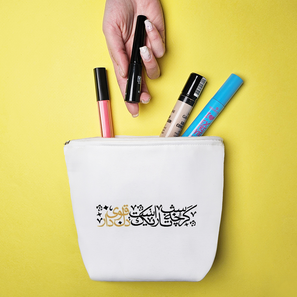 زیبایی در کنار کارایی، می‌تواند بهترین همراه برای وسایل روزمره باشد. در طراحی کیف لوازم آرایش خندالو طرح شعر نوشته این اصل در نظر گرفته شده تا محصولی شیک، کاربردی و بادوام در اختیار شما باشد. این کیف‌ها از پارچه‌ی هازان مقاوم ساخته شده‌اند که علاوه بر ظاهر زیبا، استحکام بالایی نیز دارد. ابعاد کیف لوازم آرایش خندالو طرح شعر نوشته ۲۲×۱۶ سانتی‌متر است و طراحی کف پاکتی ۸ سانتی‌متری آن، باعث می‌شود فضای بیشتری برای وسایل خود داشته باشید و فرم کیف بهتر حفظ شود. برای افزایش دوام و استحکام، داخل آن آسترکشی شده است. چاپ روی کیف به‌صورت دیجیتال و باکیفیت بالا انجام شده که باعث دوام و ماندگاری طرح‌ها می‌شود. این محصول کاملاً قابل شستشو است و می‌توانید بدون نگرانی از تغییر رنگ یا آسیب‌دیدگی، آن را هم با دست و هم با ماشین لباسشویی بشویید. یکی دیگر از ویژگی‌های کیف لوازم آرایش خندالو طرح شعر نوشته، بسته‌بندی شیک و زیبا آن است که آن را به گزینه‌ای ایده‌آل برای هدیه دادن تبدیل می‌کند. این کیف نه‌تنها برای نگهداری لوازم آرایشی و بهداشتی، بلکه برای سایر وسایل ضروری نیز مناسب است. محصولی که در کنار کاربردی بودن، به سبک زندگی شما زیبایی و نظم می‌بخشد. کیف لوازم آرایش خندالو، همراهی زیبا و ماندگار برای شما!