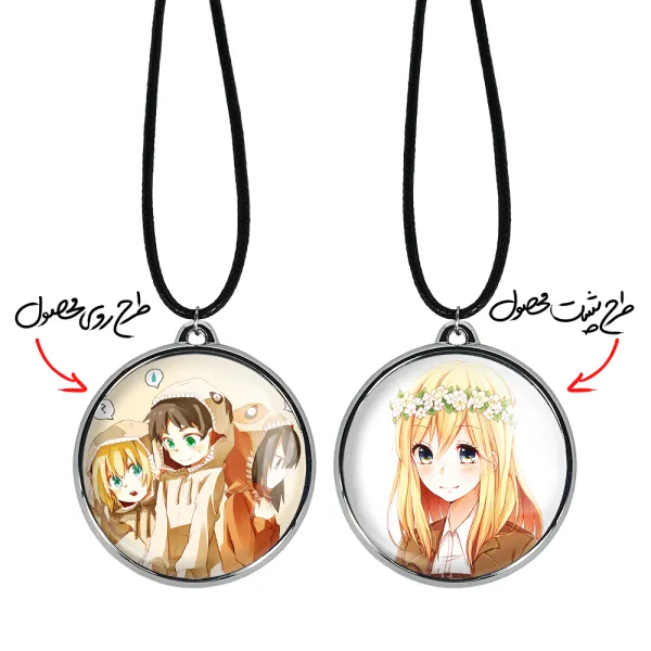 گردنبند خندالو طرح میکاسا و ارن و ارمین انیمه اتک آن تایتان Attack on Titan ، محصولی جدید و جذاب است که بصورت دو طرفه بوده، و در هر یک از طرفین گردنبند، طرح متفاوتی از یک موضوع چاپ شده است. دور پلاک گردنبند را، رینگی از جنس کروم نقره ای پوشانده که رنگ آن ثابت بوده و باعث هرچه زیباتر شدن گردنبند می شود. روکش براق روی گردنبند، مقاومت بالایی دارد و در مقابل عرق بدن با دوام بوده و با رطوبت های کم، به طرح آسیبی وارد نمی شود. چاپ گردنبند خندالو طرح میکاسا و ارن و ارمین انیمه اتک آن تایتان Attack on Titan بوسیله بهترین دستگاه های چاپ دیجیتال صورت می گیرد و طرح با شفافیتی مثال زدنی بر روی گردنبند نقش می بندد.