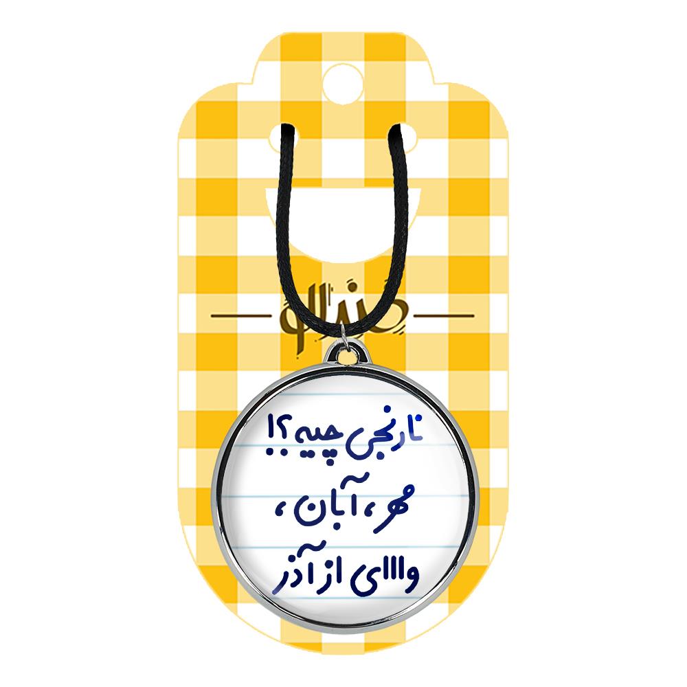 گردنبند خندالو طرح نارنجی چیه؟!! مهر، آبان، وااای از آذر ، محصولی جدید و جذاب است که بصورت دو طرفه بوده، و در هر یک از طرفین گردنبند، طرح متفاوتی از یک موضوع چاپ شده است. دور پلاک گردنبند را، رینگی از جنس کروم نقره ای پوشانده که رنگ آن ثابت بوده و باعث هرچه زیباتر شدن گردنبند می شود. روکش براق روی گردنبند، مقاومت بالایی دارد و در مقابل عرق بدن با دوام بوده و با رطوبت های کم، به طرح آسیبی وارد نمی شود. چاپ گردنبند خندالو طرح نارنجی چیه؟!! مهر، آبان، وااای از آذر بوسیله بهترین دستگاه های چاپ دیجیتال صورت می گیرد و طرح با شفافیتی مثال زدنی بر روی گردنبند نقش می بندد. جنس بند گردنبند ها نیز تولید شده از چرم صنعتی ست و با ضخامت و مقاومت بالایی که دارد آسیبی نمی بیند. زنجیر بوسیله قفل آبکاری شده به رنگ نقره ای، قابل باز و بسته شدن است که استفاده از آن را راحت تر می کند. همچنین بسته بندی مینیمال و منحصر به فرد خندالو، گردنبند ها را تبدیل به هدیه ای جذاب می کند که با قیمت مناسب و تنوع طرحی بسیار بالایی که از همه موضوعات دارد، میتواند برای هر سلیقه ای خوشحال کننده باشد.
