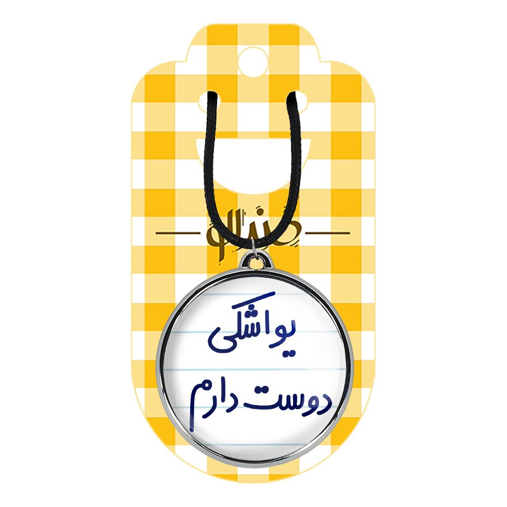 گردنبند خندالو طرح یواشکی دوست دارم ، محصولی جدید و جذاب است که بصورت دو طرفه بوده، و در هر یک از طرفین گردنبند، طرح متفاوتی از یک موضوع چاپ شده است. دور پلاک گردنبند را، رینگی از جنس کروم نقره ای پوشانده که رنگ آن ثابت بوده و باعث هرچه زیباتر شدن گردنبند می شود. روکش براق روی گردنبند، مقاومت بالایی دارد و در مقابل عرق بدن با دوام بوده و با رطوبت های کم، به طرح آسیبی وارد نمی شود. چاپ گردنبند خندالو طرح یواشکی دوست دارم بوسیله بهترین دستگاه های چاپ دیجیتال صورت می گیرد و طرح با شفافیتی مثال زدنی بر روی گردنبند نقش می بندد.
